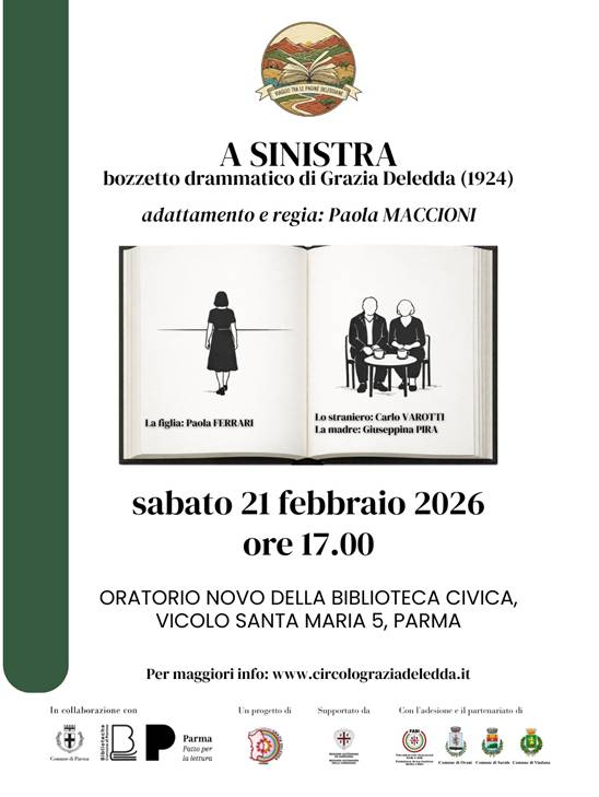 Il Circolo Culturale Grazia Deledda di Parma è lieto di invitarvi sabato 21 febbraio alle ore 17.00 al secondo appuntamento di “Viaggio tra le pagine deleddiane”, un percorso dedicato alla scoperta e alla riscoperta dell’opera dell’autrice sarda di cui il nostro circolo prende il nome, a centro anni dal conferimento del Premio Nobel per la lettatura.