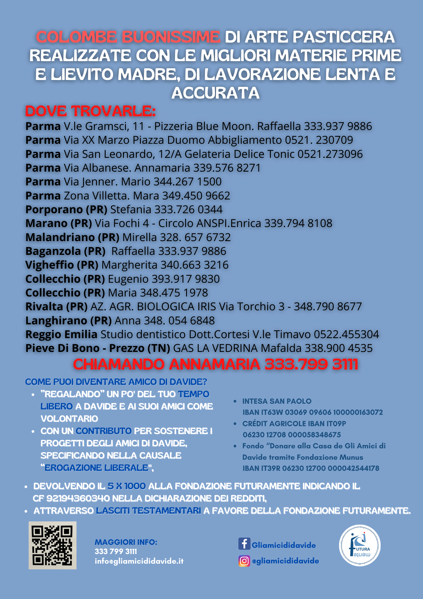 Oltre a regalarti una colomba o farne un gradito dono ad amici e parenti puoi anche collaborare nel suggerirci altri canali di distribuzione.