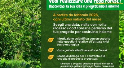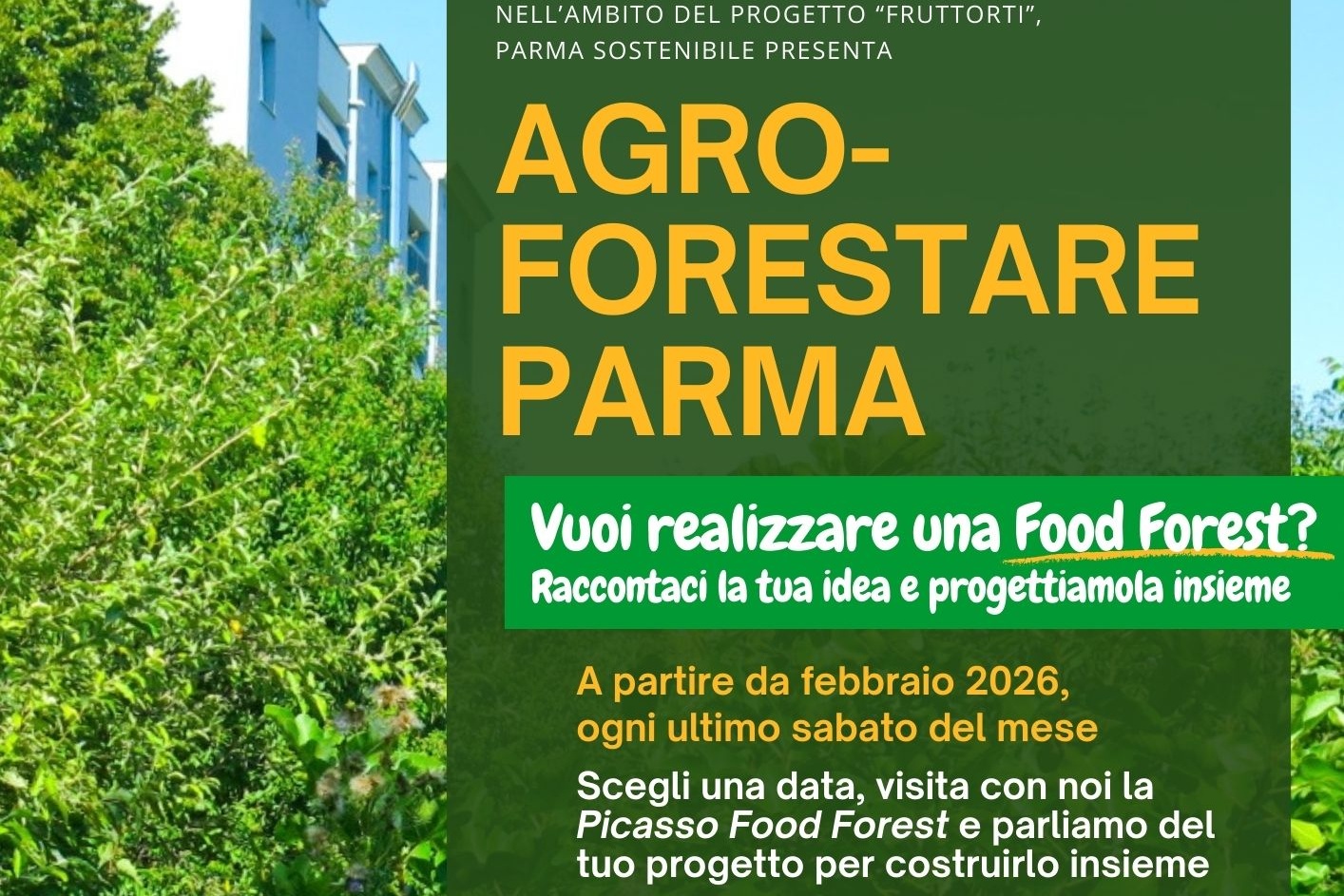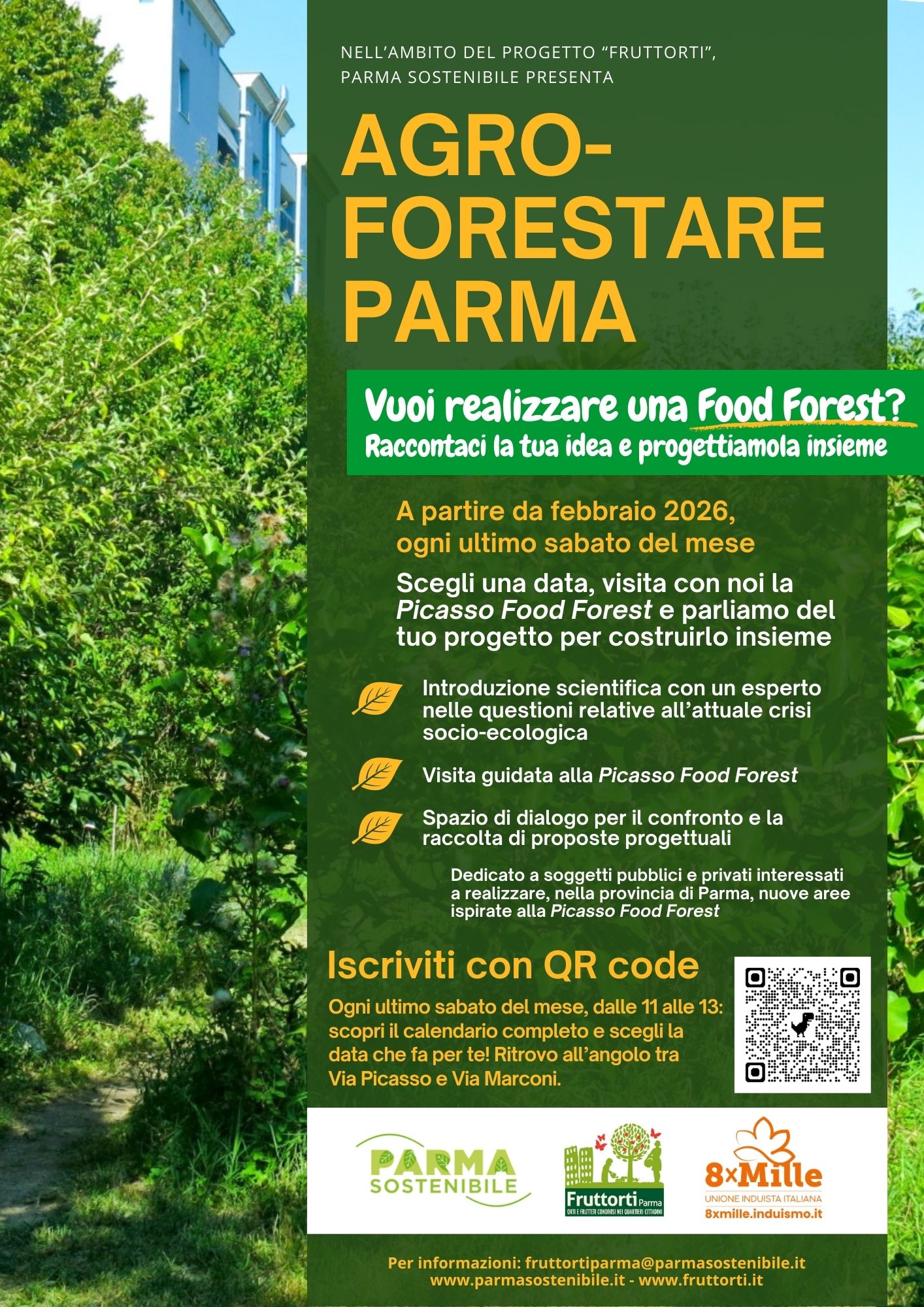 “Agro-forestare Parma” è un programma d’incontri formativi gratuiti, un incontro unico che sarà riproposto tutti gli ultimi sabati del mese dalle 11 alle 13 , a partire dal 28 febbraio, per tutto il 2026, organizzato da Parma Sostenibile nell’ambito del progetto “Fruttorti Parma”, presso la Picasso Food Forest. Il programma punta a diffondere conoscenze sull’attuale crisi socio-ecologica e a contribuire a moltiplicare, nel territorio parmense, le aree gestite ispirandosi al modello della Picasso Food Forest, intese come parte delle urgenti risposte da dare alla citata crisi. Gli incontri sono tenuti da un operatore di Parma Sostenibile, esperto nelle questioni relative all’attuale crisi socio-ecologica, e si rivolgono a enti pubblici, associazioni, scuole, cooperative sociali, istituzioni culturali, aziende e cittadini della provincia di Parma, interessati a conoscere la Picasso Food Forest e le esigenze a cui questa risponde, ma anche, eventualmente, ad avviare con Parma Sostenibile la co-progettazione di nuovi spazi ispirati alla Picasso Food Forest.