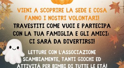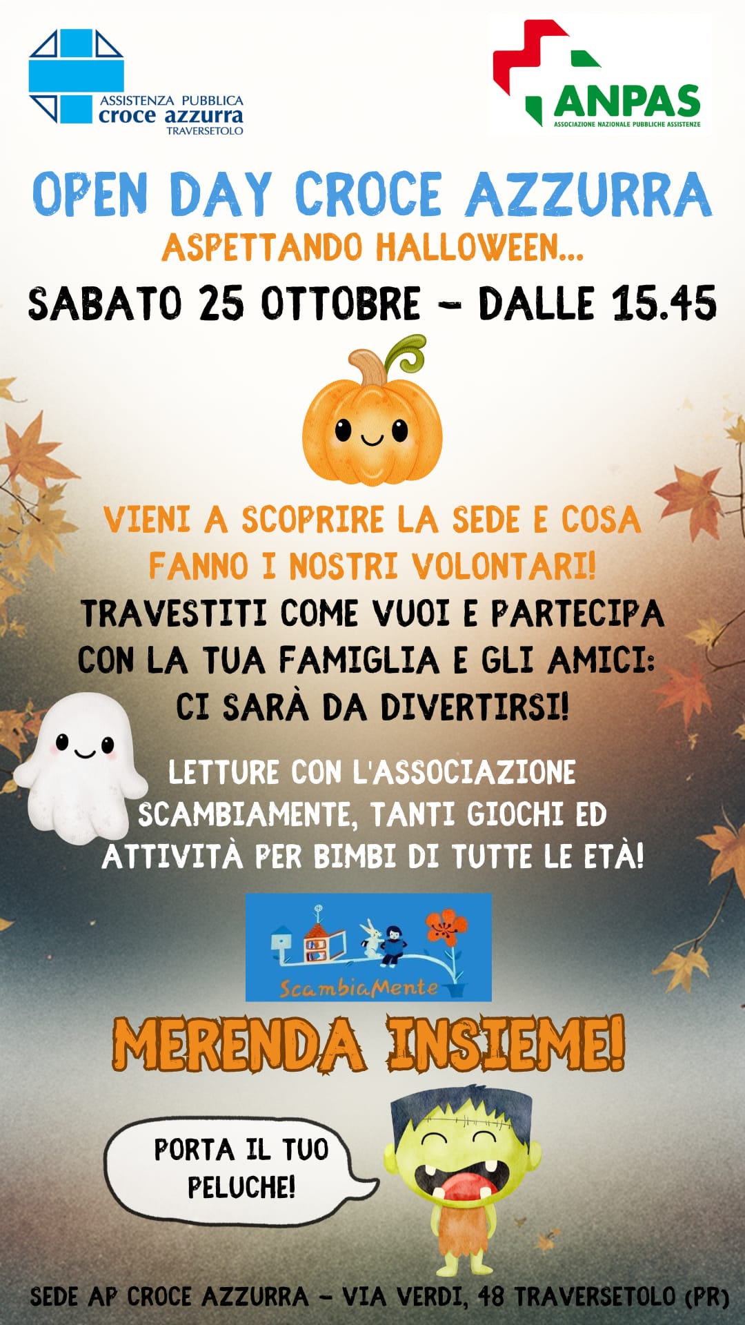 In occasione della Giornata Nazionale delle Pubbliche Assistenze, sabato 25 ottobre dalle 15,45 la Croce Azzurra di Traversetolo apre le porte della propria sede per mostrare cosa fanno i volontari ogni giorno, per stare insieme, imparare divertendosi e scoprire quanto può essere bello fare parte del mondo del volontariato…il tutto a tema Halloween!