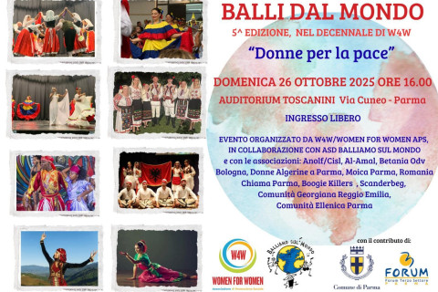 L’evento, a ingresso libero, è organizzato da W4W/Women for Women APS in collaborazione con ASD Balliamo sul Mondo e una ricca rete di associazioni attive sul territorio, tra cui Anolf/Cisl, Al-Amal, Betania Odv Bologna, Donne Algerine a Parma, Moica Parma, Romania Chiama Parma, Boogie Killers, Scanderbeg, Comunità Georgiana Reggio Emilia, e Comunità Ellenica Parma.