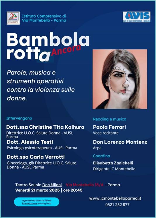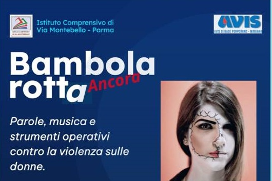 A.V.I.S. di base Porporano e Mariano ODV e Istituto Comprensivo di via Montebello invitano venerdì 21 marzo alle ore 20,45, presso il Teatro scuola Don Milani in via Montebello 18/A a Parma, alla serata “Bambola rotta…ancora”, parole, musica e strumenti operativi contro la violenza sulle donne.