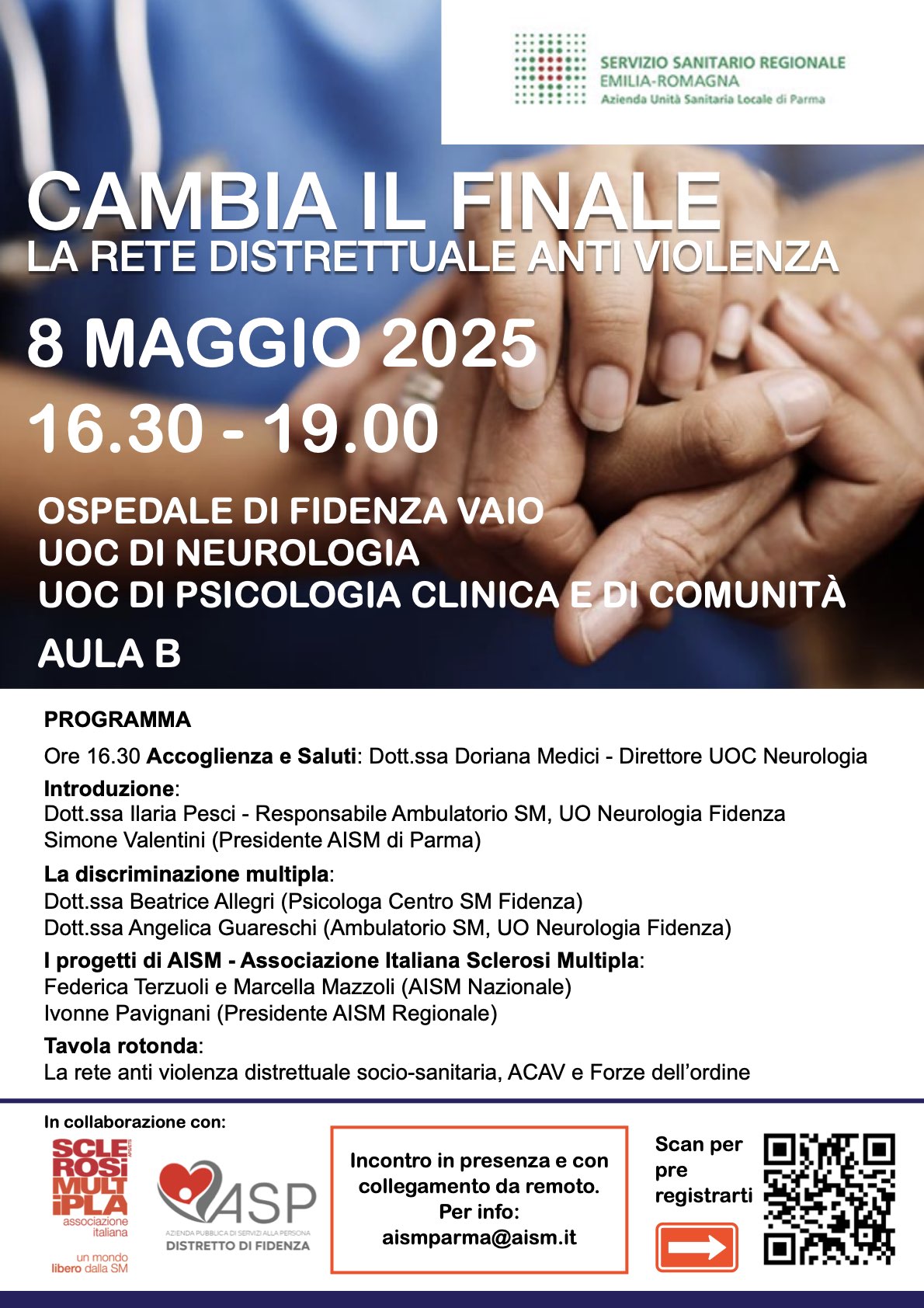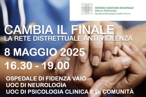 Si terrà mercoledì 8 maggio 2025, dalle 16.30 alle 19.00 presso l’Ospedale di Vaio di Fidenza (Aula B), l’incontro “Cambia il finale – La rete distrettuale antiviolenza”, promosso dalla UOC di Neurologia e dalla UOC di Psicologia Clinica e di Comunità dell’Azienda USL di Parma.