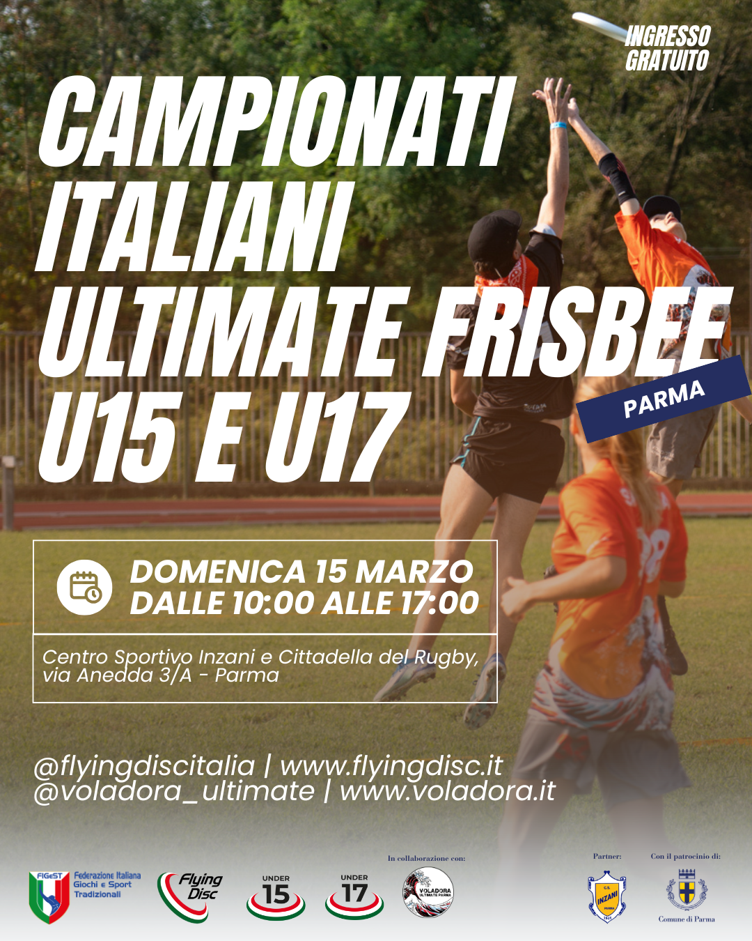 Voladora Ultimate Team è lieta di invitarVi ai Campionati Italiani JUNIOR U15 e U17 di Ultimate Frisbee che si terranno a Parma nella giornata del 15 Marzo presso l’impianto comunale di Moletolo, Via Luigi Anedda, 3/A.