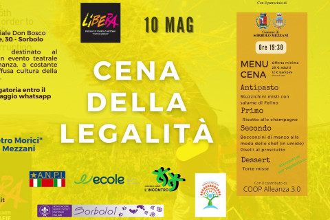 Venerdì 10 maggio, alle ore 19.30, presso il Centro Parrocchiale Don Bosco (via 4 Novembre, 30 – Sorbolo), il Presidio “Pietro Morici” di Libera Sorbolo Mezzani organizza la Cena della Legalità, un momento conviviale a sostegno della diffusione di una cultura della legalità sul territorio.