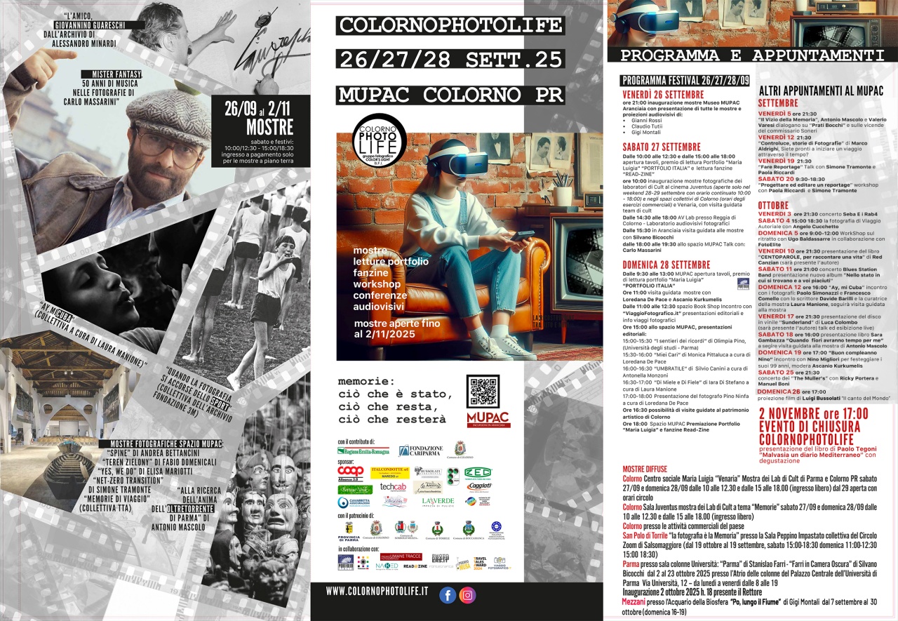 Dal 26 settembre al 2 novembre 2025, l’Aranciaia di Colorno, dal grande valore storico e con il suo fascino unico, si trasformerà in una galleria colorata, ricca di storie da raccontare attraverso la fotografia che diventa linguaggio universale per esplorare il tema “Memorie: ciò che è stato, ciò che resta, ciò che resterà”.