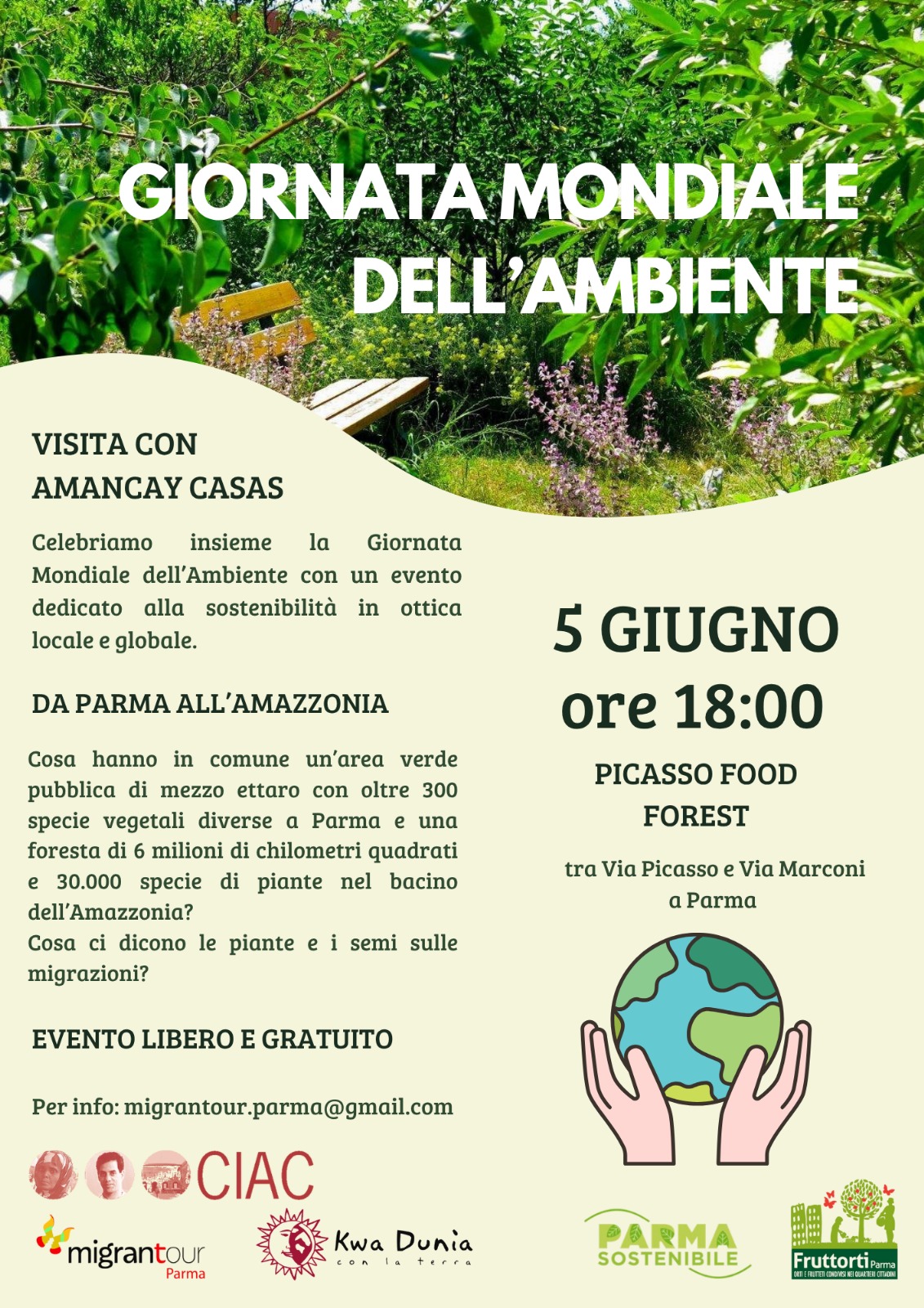 Ciac, Kwa Dunia, Migrantour, Parma Sostenibile e Fruttorti invitano a celebrare la Giornata Mondiale dell’Ambiente, partecipando a un’esperienza immersiva nella natura e nella cultura sostenibile, giovedì 5 giugno alle 18, alla Picasso Food Forest, Via Guglielmo Marconi 23, Parma
