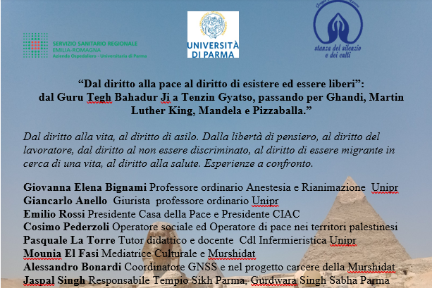 Il 17 dicembre, dalle 9.15, la Sala Congressi dell’Azienda Ospedaliero-Universitaria di Parma ospiterà il convegno “Dal diritto alla pace al diritto di esistere ed essere liberi”, promosso dall’Università di Parma (Corso di laurea in Infermieristica) in collaborazione con la Stanza del Silenzio e dei Culti.