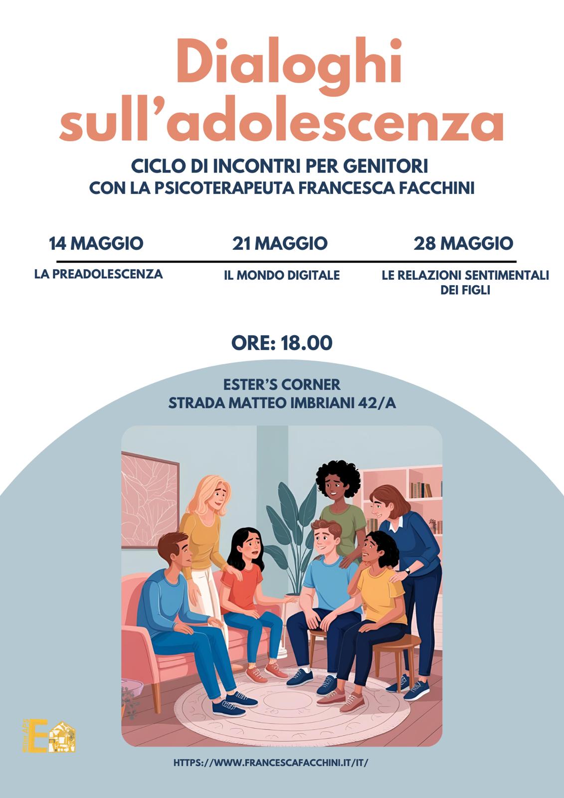 Mercoledì 14, 21 e 28 maggio alle 18 presso Ester’s Corner, in via Imbriani 42/A, Ester APS ci invita a partecipare a un ciclo tre incontri dedicato all’adolescenza.