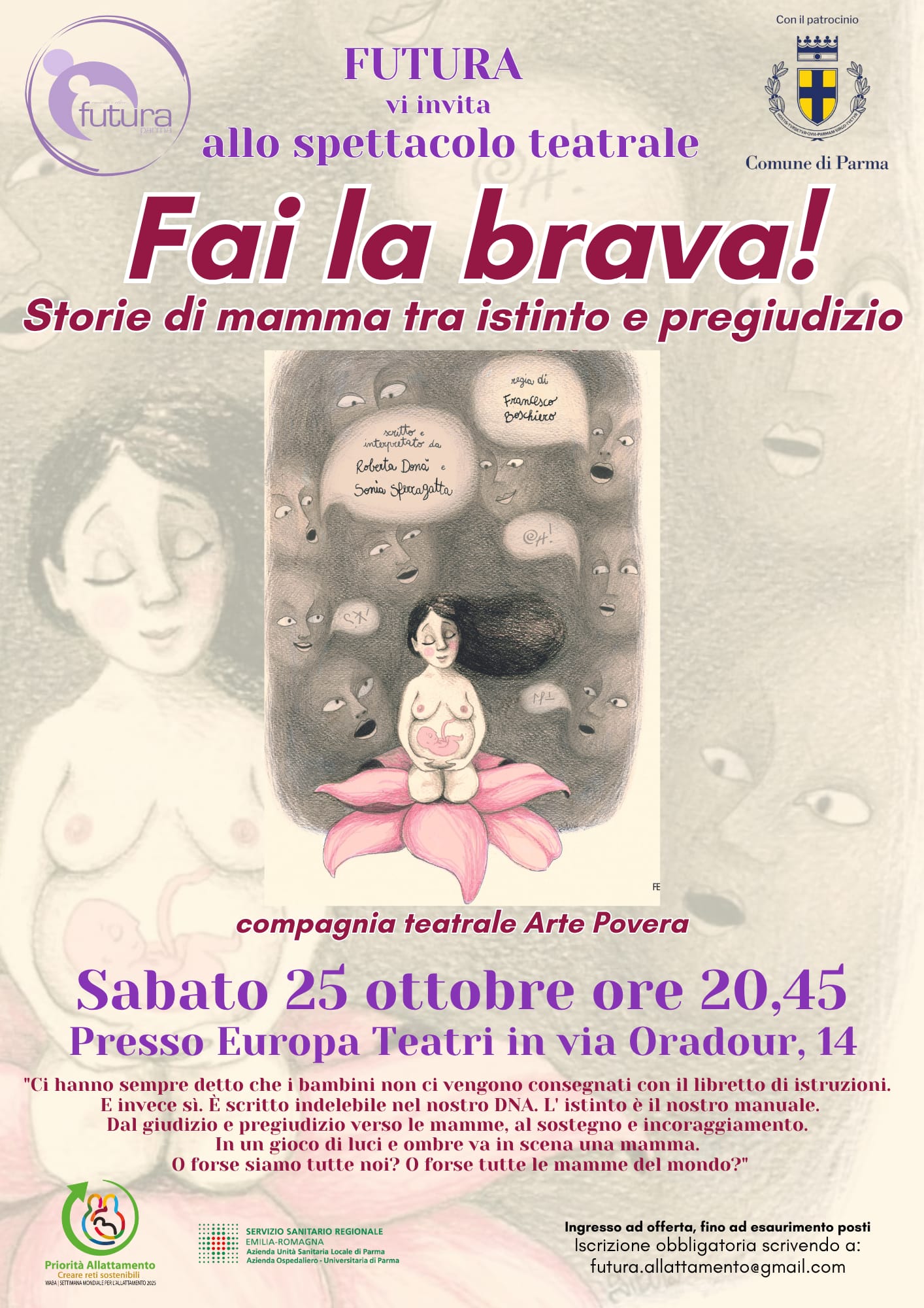 Nell’ambito della Settimana Mondiale dell’Allattamento, Associazione Futura promuove lo spettacolo teatrale “Fai la brava! Storie di mamma tra istinto e pregiudizio”, in programma sabato 25 ottobre alle 20.45 al Teatro Europa, in via Oradour 14.