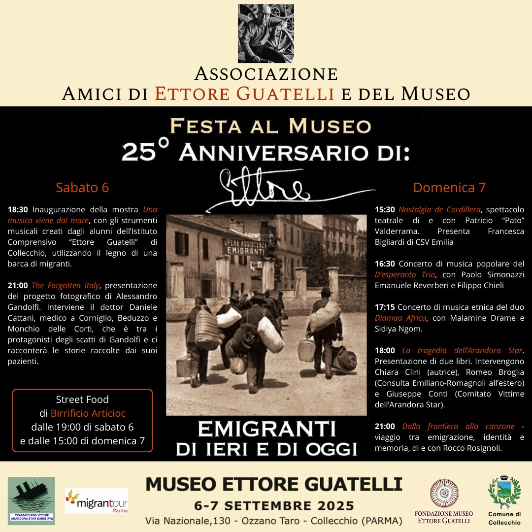 Sabato e domenica 6 e 7 settembre, torna la festa del Museo Ettore Guatelli di Ozzano Taro (Collecchio), in occasione del venticinquesimo anniversario della scomparsa del fondatore del Museo, con un focus sul tema degli emigranti di ieri e di oggi.