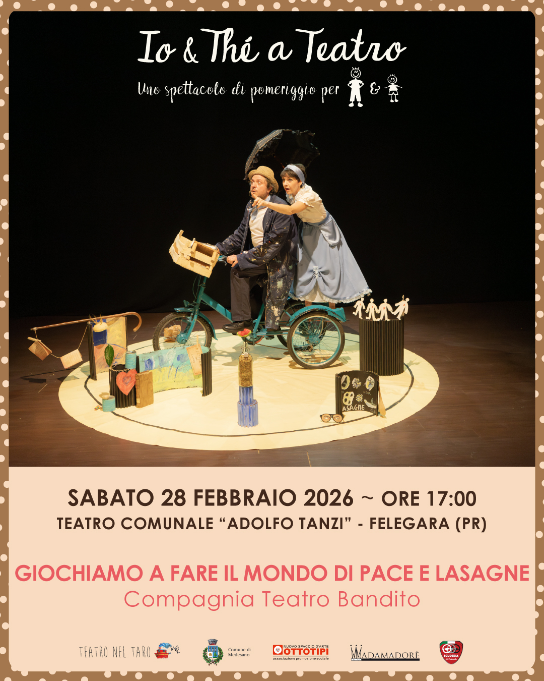 Sabato 28 febbraio alle 17, al Teatro Tanzi di Felegara, torna la rassegna “IO & THE a TEATRO” con lo spettacolo “Giochiamo a fare il Mondo di pace e lasagne” della compagnia Teatro Bandito. Uno spettacolo tratto dalle poesie, almanacchi, pitture e cassetti di Antonio Catalano.