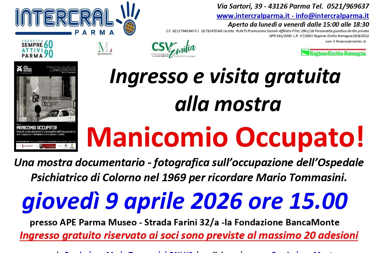 Intercral Parma propone giovedì 9 aprile alle ore 15,00 una visita con ingresso gratuito alla mostra “Manicomio occupato!”, presso APE Parma Museo, in Strada Farini 32/a, promossa dalla Fondazione Mario Tommasini in occasione del ventennale della scomparsa di Mario Tommasini, con il sostegno di Fondazione Monteparma.