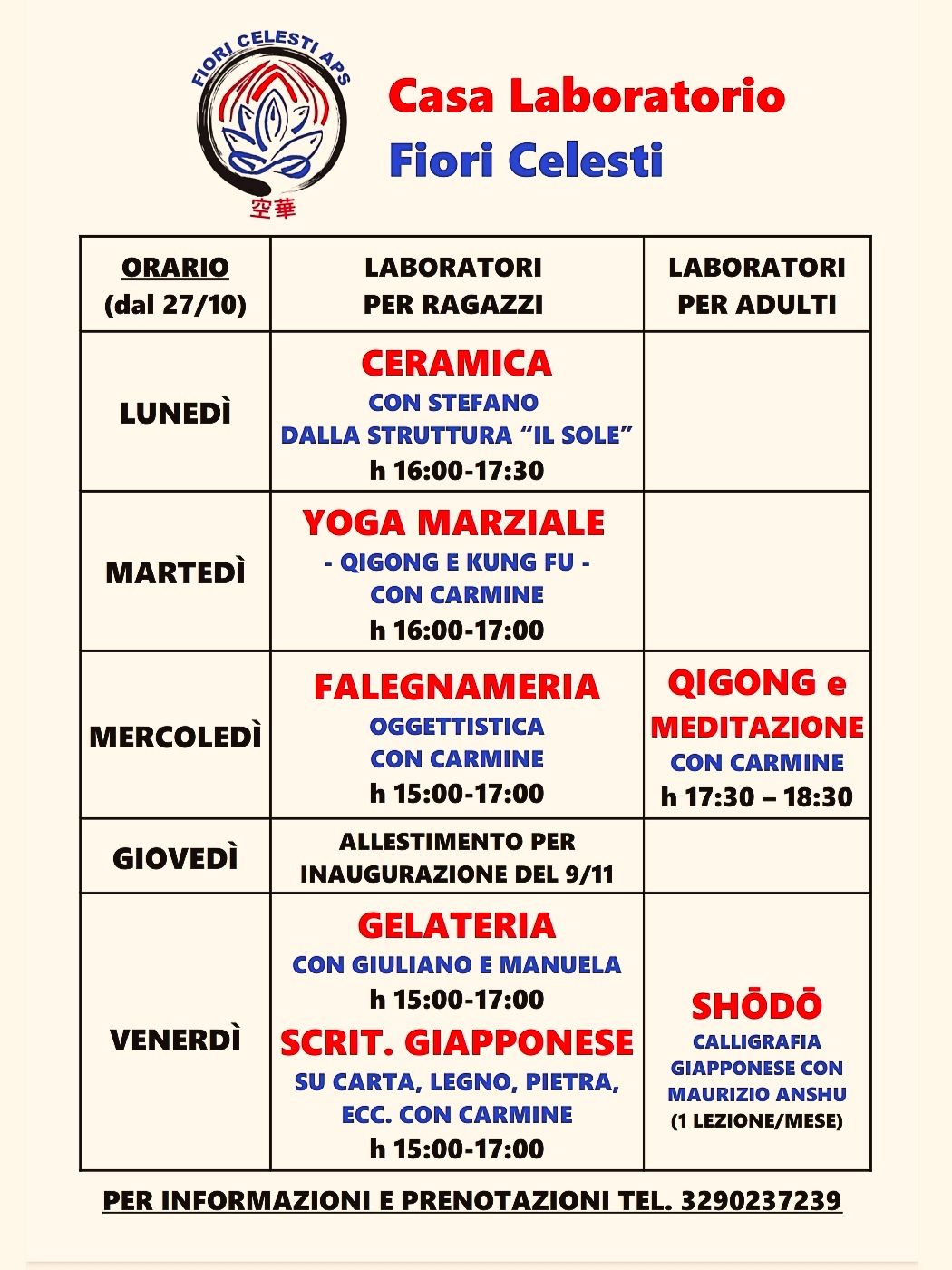 La rete e le attività della Casa Laboratorio nascono dal connubio tra il mondo dell’educazione e quello dell’arte e dell’artigianato. Il programma settimanale dei laboratori per adulti e ragazzi organizzati da Fiori Celesti presso la Casa Laboratorio è presente come allegato in questa pagina e, in alternativa, al seguente link di Facebook: https://www.facebook.com/photo/?fbid=122192757620314933&set=pb.61559448013717.-2207520000 Per prenotazioni e info sui laboratori è possibile contattare il seguente numero: 3290237239.