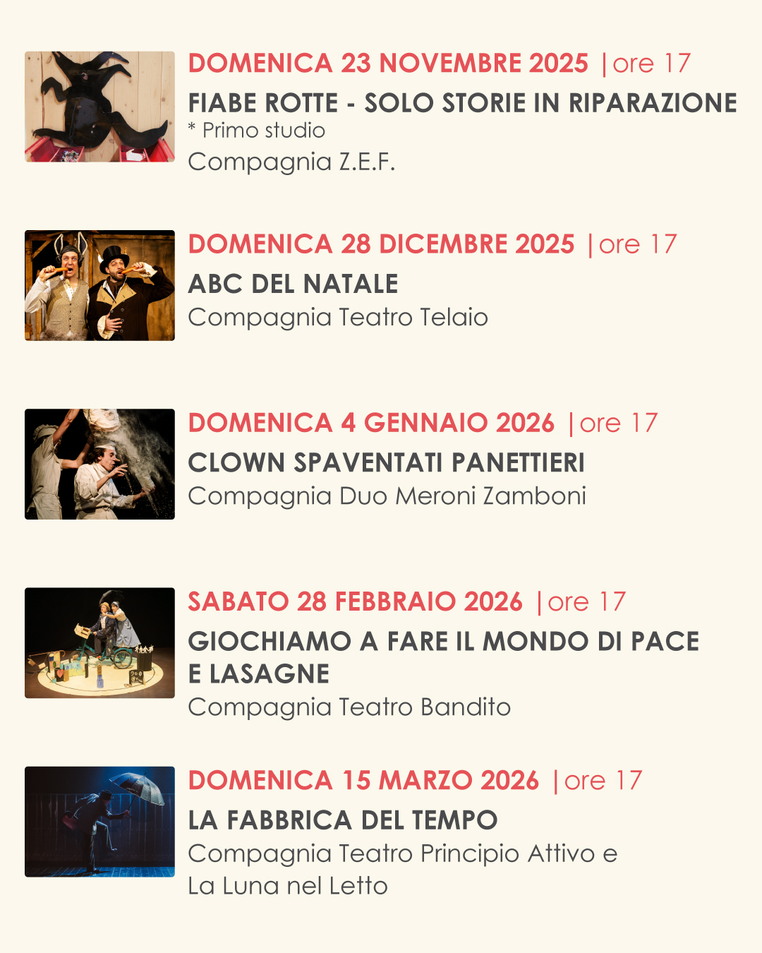 Si rinnova la consueta formula e anche quest’anno ogni spettacolo che inizia alle 17 è preceduto da una merenda a offerta libera il cui incasso viene donato a sostegno di un progetto.
