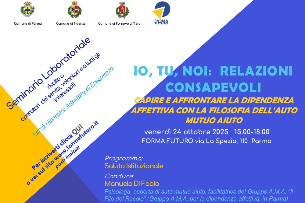 Forma Futuro invita al seminario laboratoriale “IO, TU, NOI, LORO: capire e affrontare la dipendenza affettiva con la filosofia dell’Auto Mutuo Aiuto”, giovedì 24 ottobre, dalle 15.00 alle 18.00, presso Forma Futuro, in Via La Spezia 110, Parma.