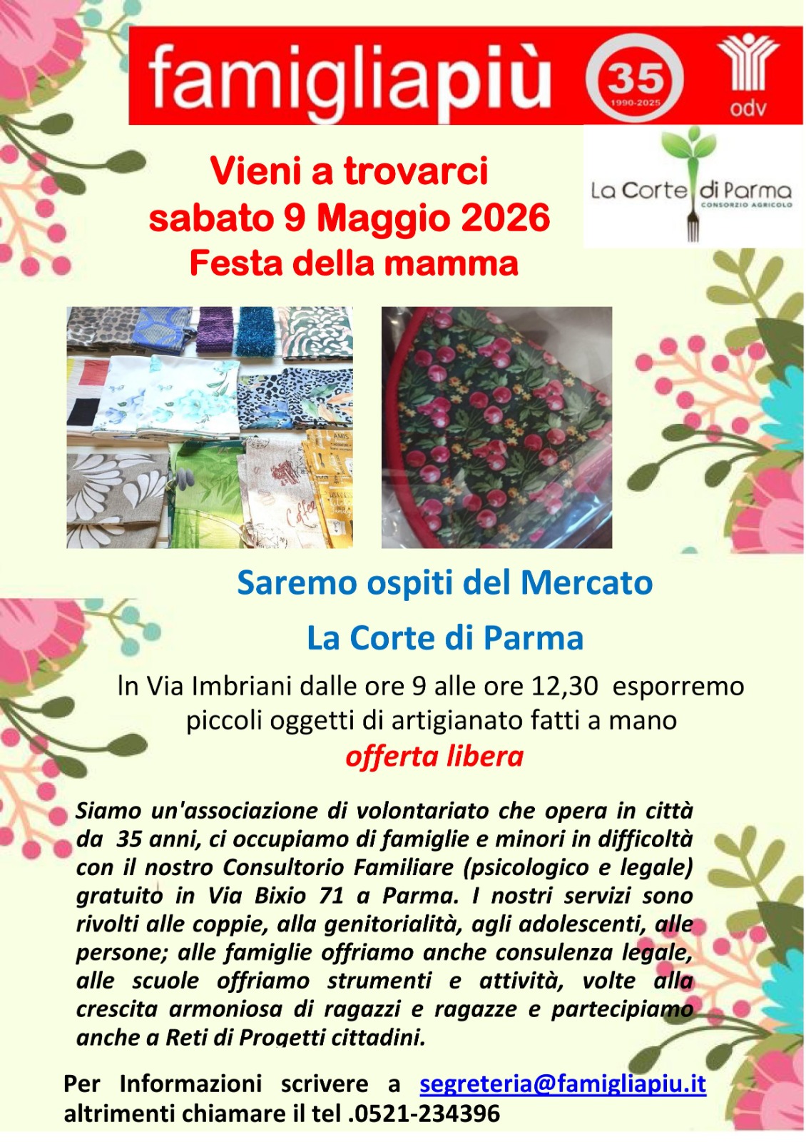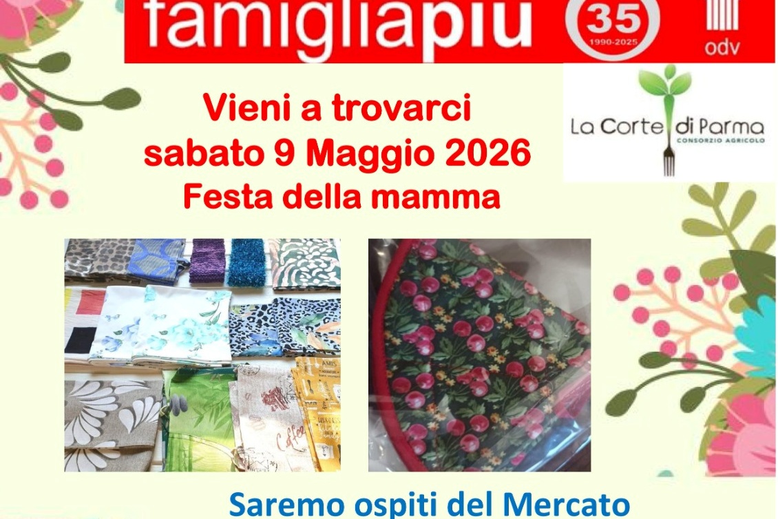 Sabato 9 maggio dalle 9 alle 12,30, in occasione della Festa della Mamma, al mercato La Corte di via D’Azeglio/via Imbriani sarà presente la bancarella dell’associazione Famiglia Più con tanti oggetti fatti a mano, ad offerta libera.