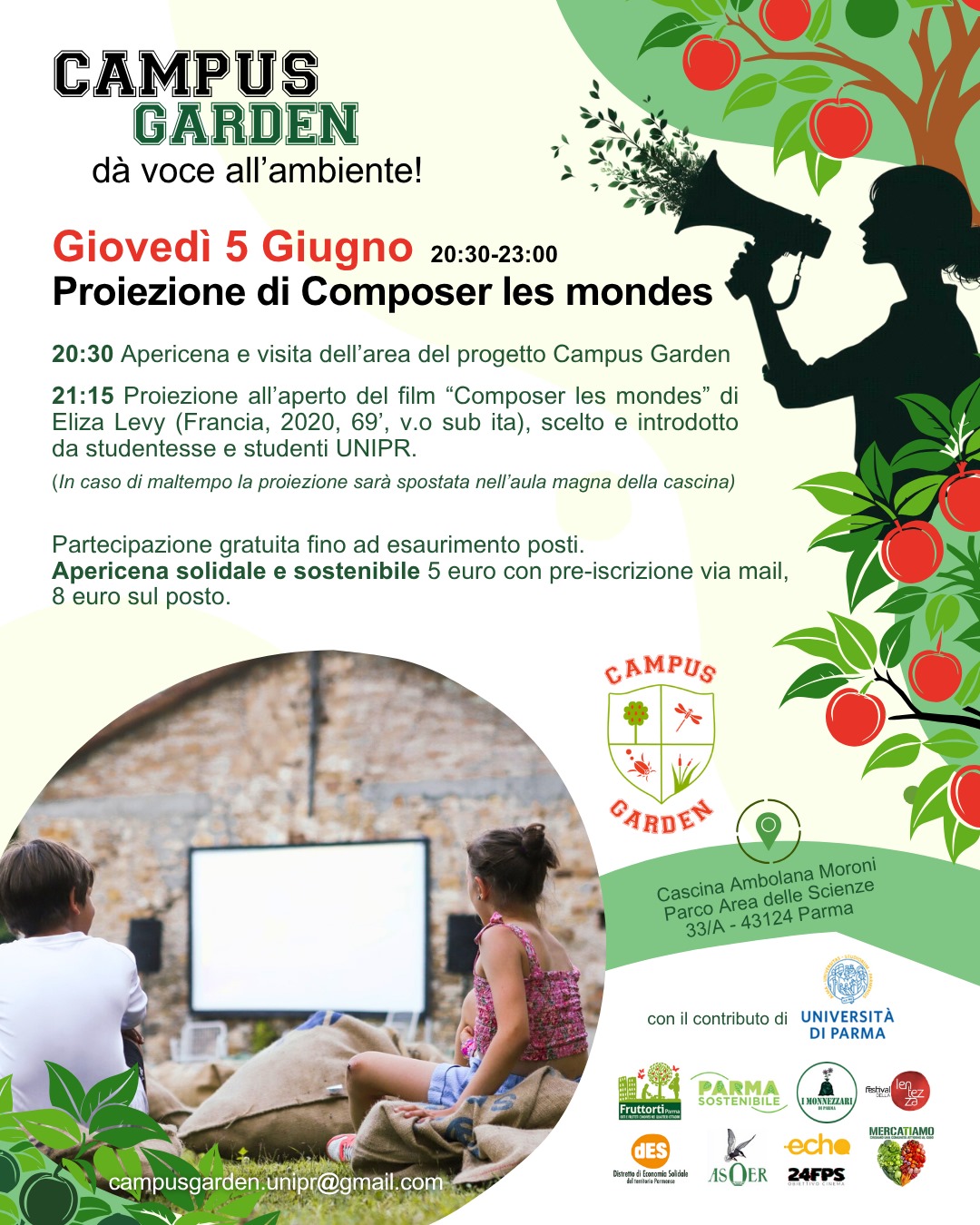 La proiezione all’aperto del film “Composer les mondes” di Eliza Levy (Francia, 2020, 69’), nell’ambito della rassegna Campus Garden dà voce all’ambiente. Il documentario è stato selezionato e sarà introdotto dalle studentesse e dagli studenti del corso di Capitale Naturale e Servizi Ecosistemici, tenuto dalla professoressa Cristina Menta e dal professor Rossano Bolpagni dell’UNIPR e organizzato dall’APS 24FPS come preludio al festival cinematografico Insostenibile. Locandina allegata.