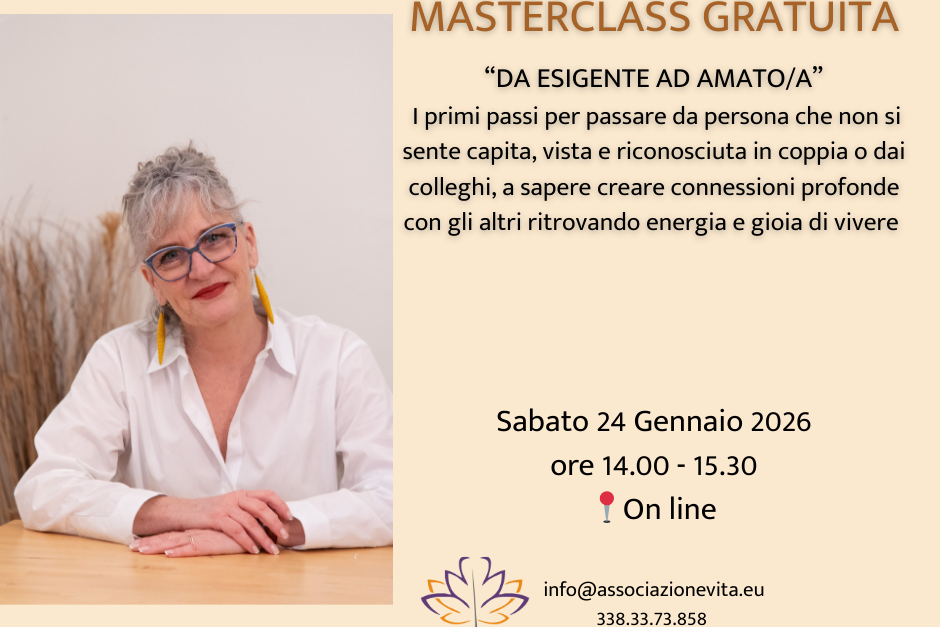 Associazione Vita propone sabato 24 gennaio dalle ore 14,00 alle 15,30 la masterclass online “da esigente ad amata: i primi passi per passare da persona perfezionista che non si sente capita, vista e ricambiata in coppia o dai colleghi, a saper creare connessioni profonde con gli altri ritrovando energia e gioia di vivere”
