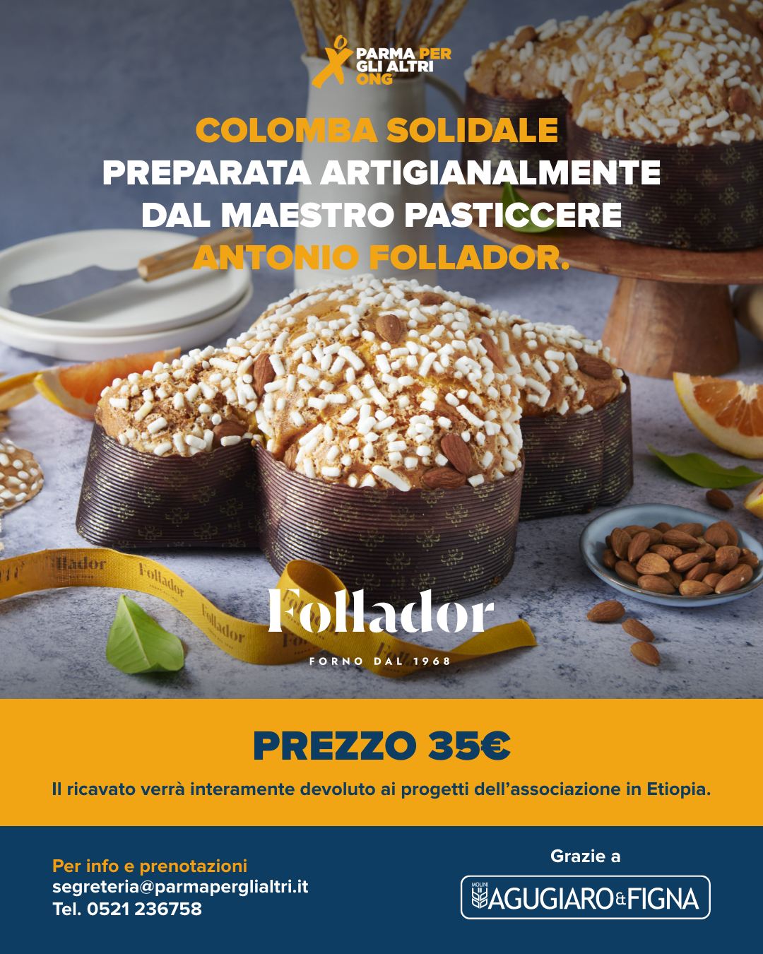 Pasqua è alle porte: ormai ci siamo, stanno per arrivare le buonissime colombe solidali di Parma per gli Altri, preparate artigianalmente dal bravissimo Maestro Pasticcere Antonio Follador, titolare del Forno Follador, grazie anche alla preziosa collaborazione di Agugiaro&Figna Molini.