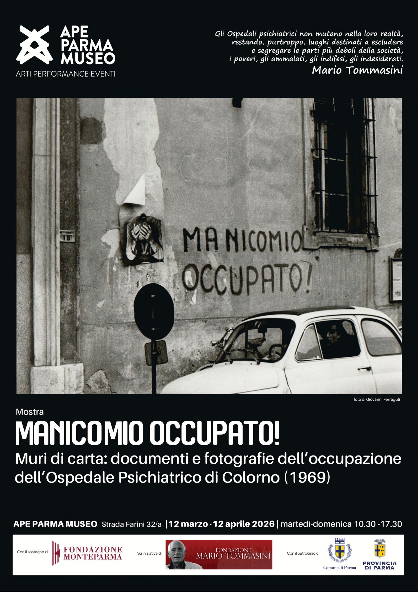 I 35 giorni di occupazione sono raccontati all’APE Parma Museo (Strada Farini 32/a) nella mostra “Manicomio occupato!” promossa dalla Fondazione Mario Tommasini in occasione del ventennale della scomparsa di Mario Tommasini, con il sostegno di Fondazione Monteparma e il patrocinio del Comune di Parma e della Provincia di Parma, visitabile dal 12 marzo al 12 aprile.