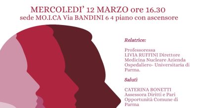 Relatrice Livia Ruffini – Direttore Medicina Nucleare Azienda Ospedaliera Universitaria di Parma. Intervengono: -Caterina Bonetti Assessore Diritti e Pari Opportunità Comune di Parma -Cina Foglia Presidente Moica