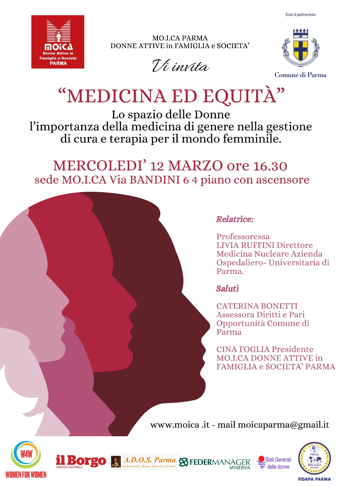 L’associazione Moica – Donne Attive in Famiglia e Società invita mercoledì 12 marzo alle ore 16,30, presso la sede dell’associazione in via Bandini 6 a Parma, al convegno “Medicina ed equità” L’importanza della medicina di genere nella gestione di cura e terapia per il mondo femminile.