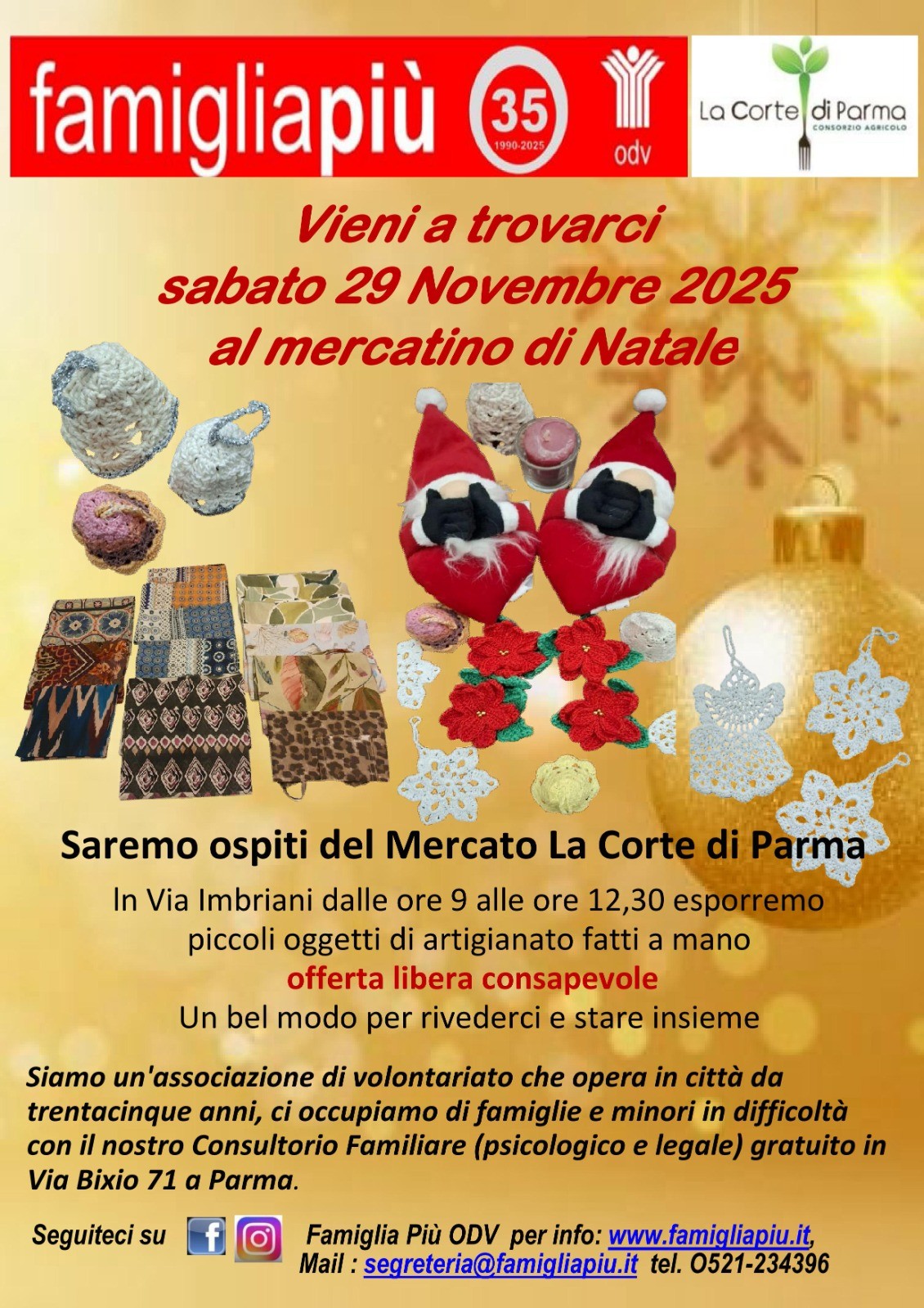 Sabato 29 novembre, dalle 9 alle 12:30, Famiglia Più organizza un Mercatino di Natale presso il Mercato La Corte di Parma-Via Imbriani.