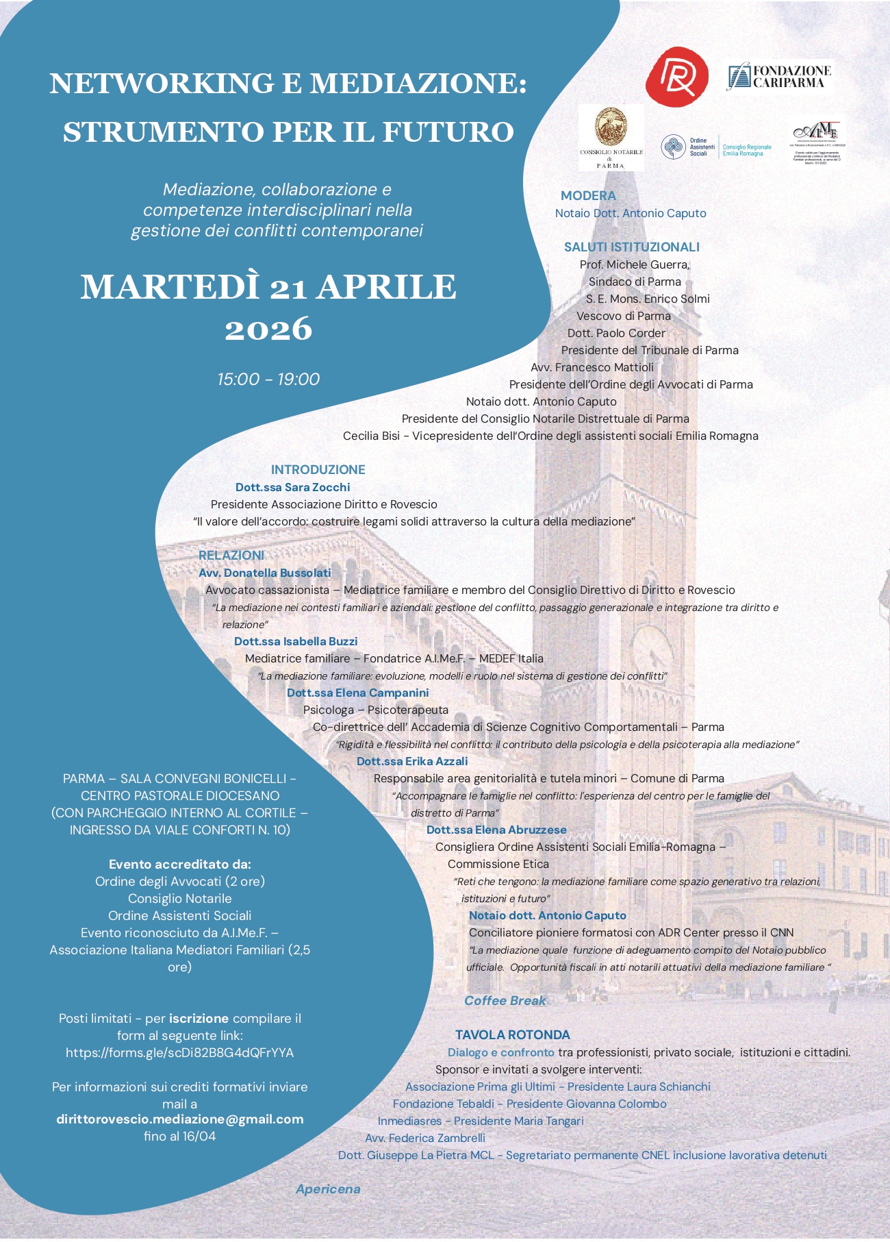 L’associazione Diritto e Rovescio invita martedì 21 aprile dalle ore 15,00, presso la Sala Convegni Bonicelli – Centro Pastorale Diocesano (con parcheggio interno al cortile – ingresso da Viale Conforti 10) al convegno “Networking e mediazione: strumento per il futuro”.