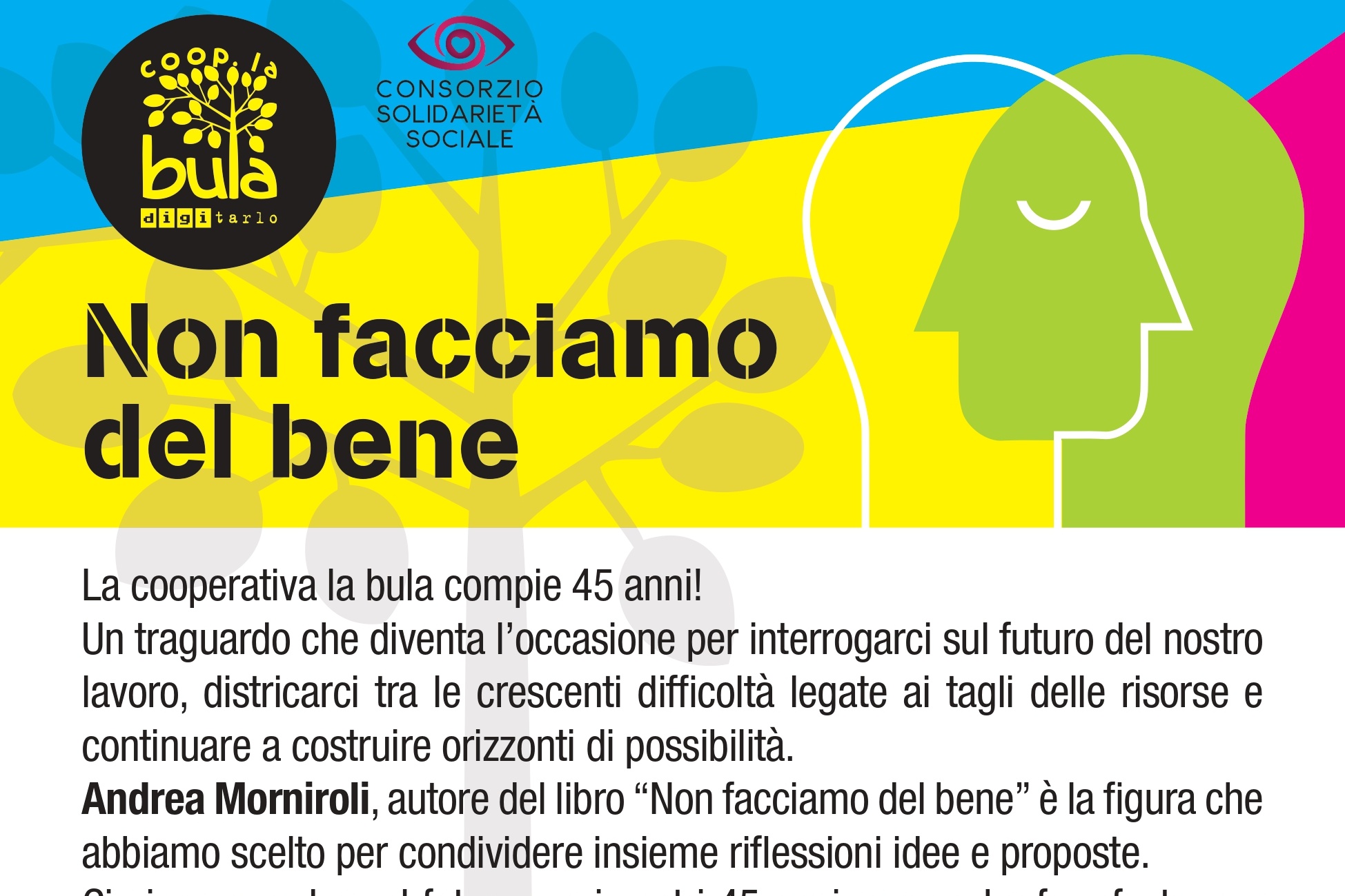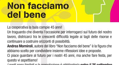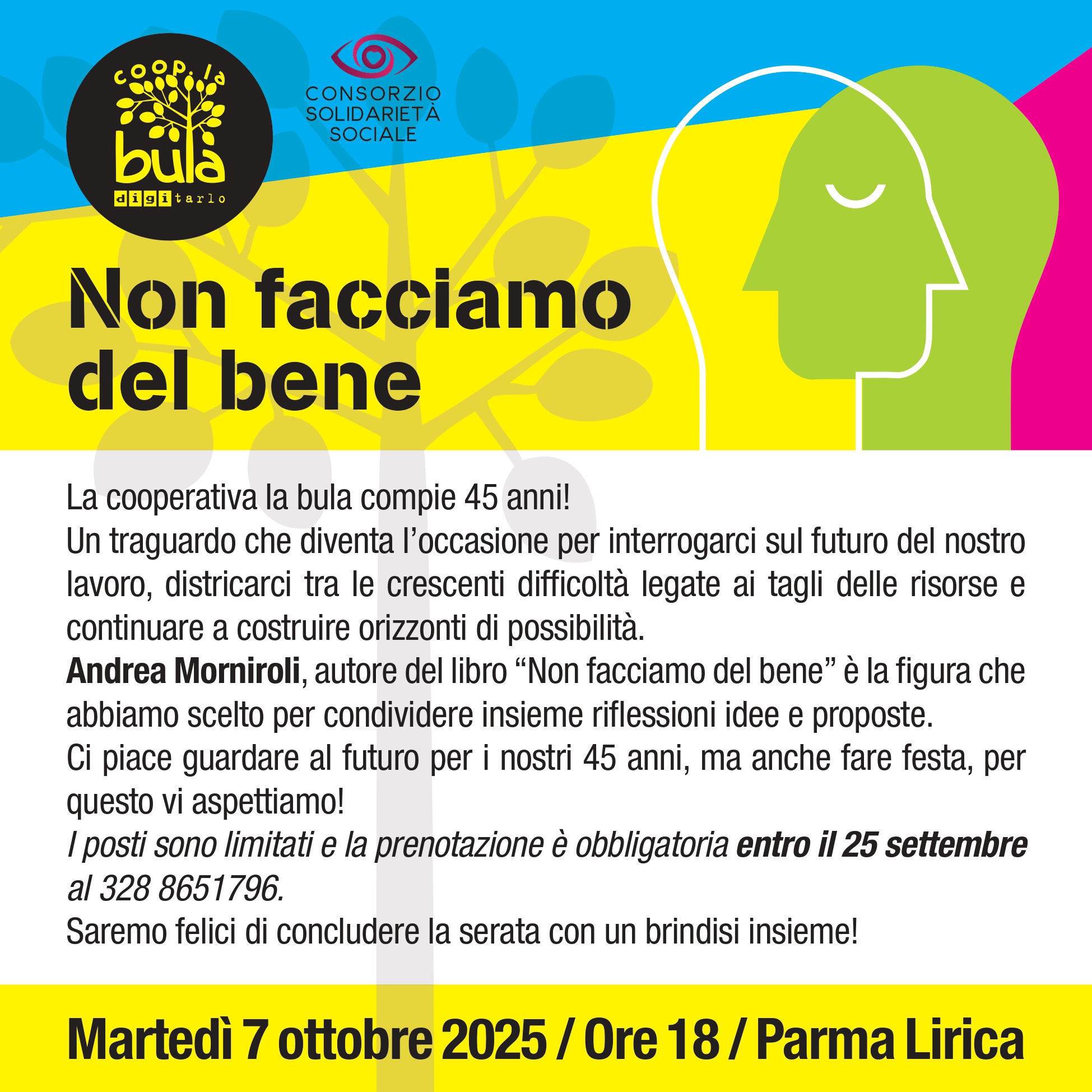 La coop sociale la Bula compie 45 anni! Per l’occasione ha deciso di festeggiare i suoi 45 anni di attività con un evento di forte valore culturale: martedì 7 ottobre alle 18,00, presso Parma Lirica, verrà presentatoil libro “Non facciamo del bene” di Andrea Morniroli, testo che sarà lo spunto di riflessione della serata.
