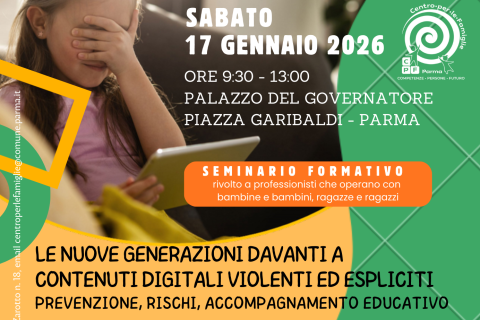 Il Centro per le Famiglie di Parma organizza un seminario formativo rivolto a professionisti che operano con bambine e bambini, ragazze e ragazzi, sul tema della prevenzione e del contrasto ai contenuti digitali violenti ed espliciti con focus su prevenzione, rischi e accompagnamento educativo.