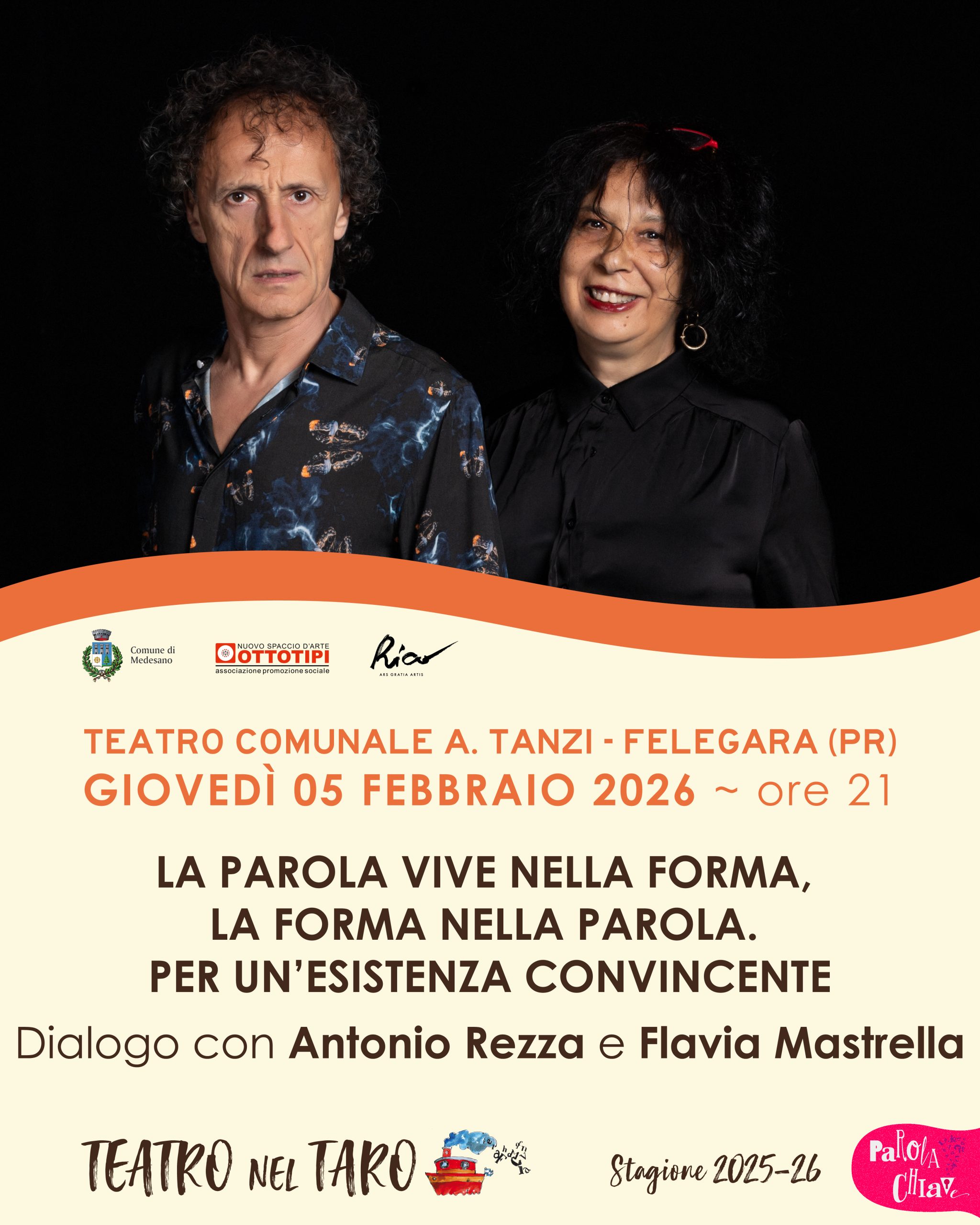 Giovedì 5 febbraio alle 21.00 al Teatro Tanzi di Felegara ci saranno Antonio Rezza e Flavia Mastrella, due delle voci più irrequiete e brillanti del panorama culturale degli ultimi 30 anni.