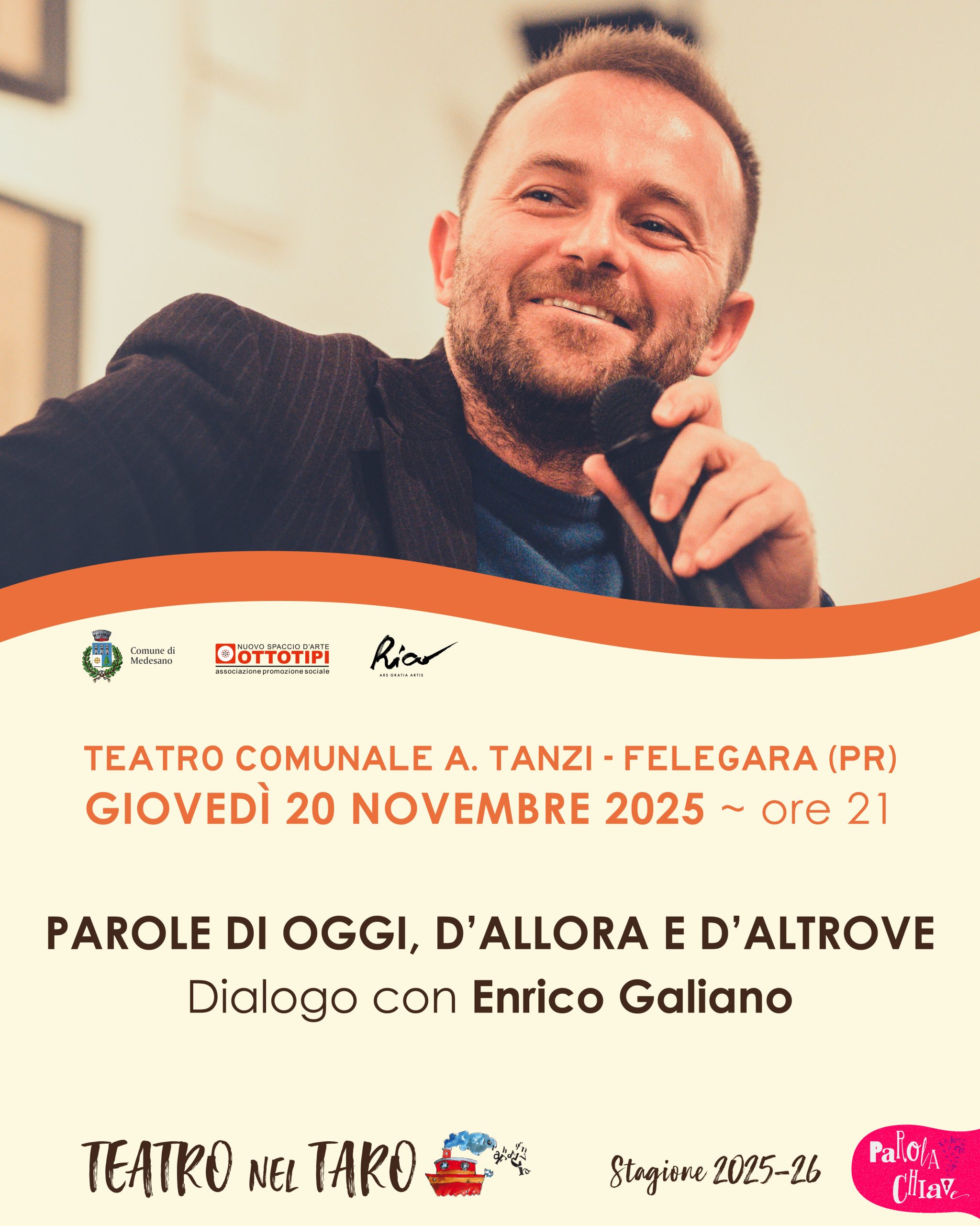 A Felegara Teatro nel Taro, la stagione teatrale con la direzione artistica dell’APS Ottotipi, porta in scena Enrico Galiano nel dialogo “Parole di oggi, d’allora e di altrove”