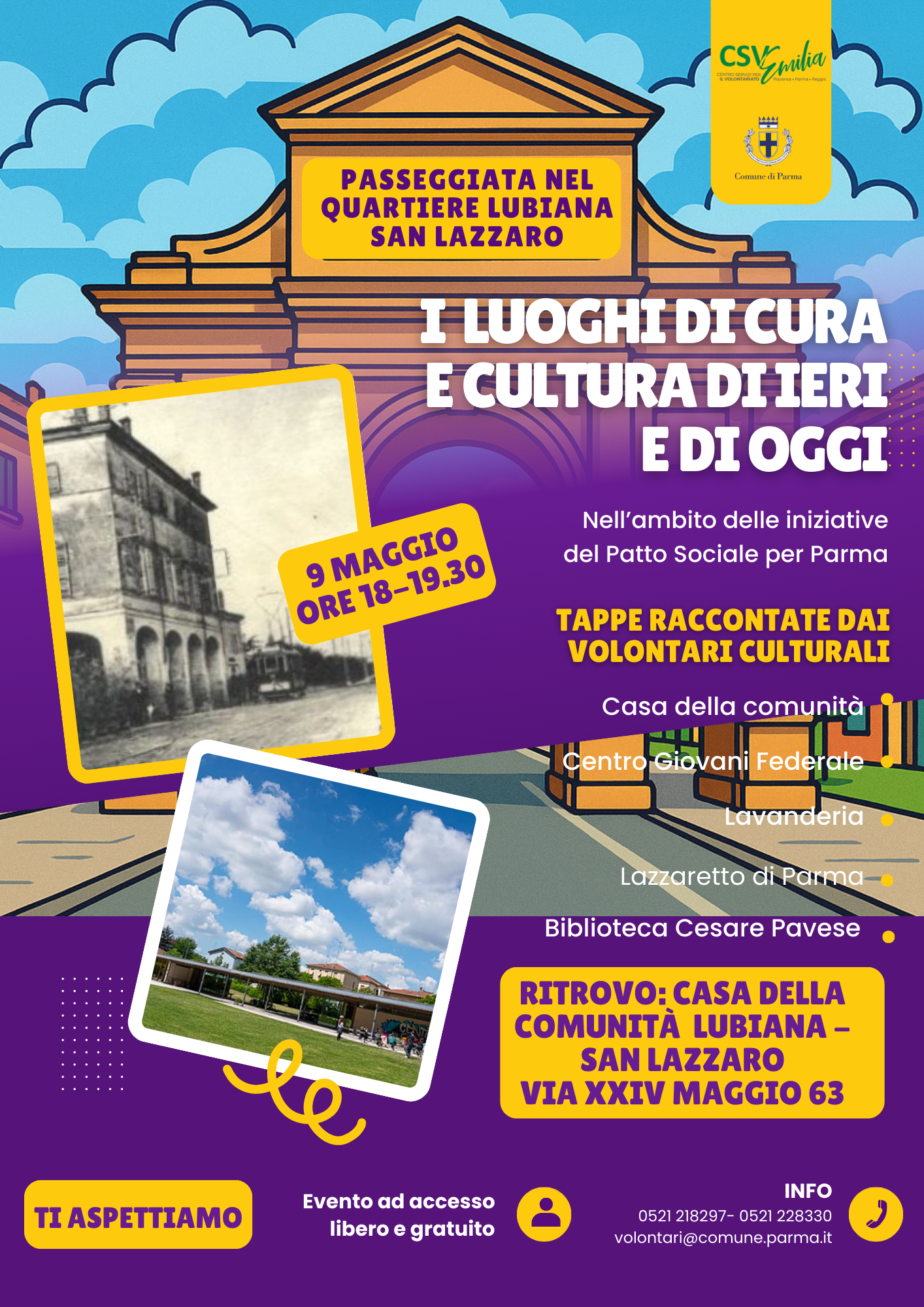 La prima passeggiata vedrà l’itinerario “Luoghi di cura di ieri e di oggi” e si svolgerà nell’ambito delle iniziative del Patto Sociale per Parma, venerdì 9 maggio alle ore 18 con partenza dalla Casa di Comunità Lubiana – San Lazzaro di Via XXIV Maggio 63.