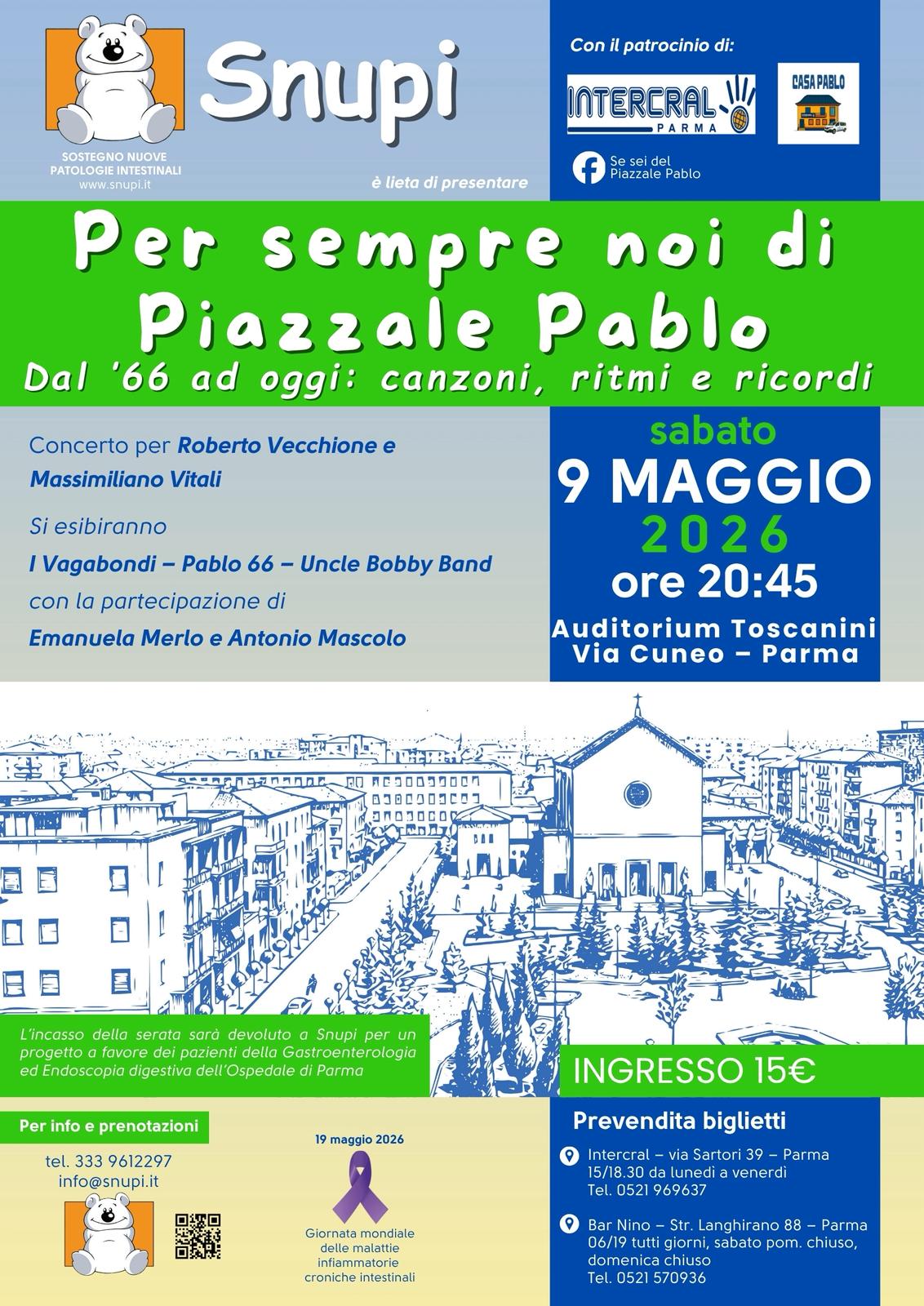 SNUPI ODV, in collaborazione con l’associazione “Per Sempre Noi di Piazzale Pablo” e con il patrocinio di Intercral e Casa Pablo, organizza sabato 9 maggio alle ore 20,45, presso l‘Auditorium Toscanini – Via Cuneo a Parma, il concerto benefico “C’era una volta Piazzale Pablo”, cuore pulsante dei Prati Bocchi: c’eravamo noi, con le nostre chitarre, le nostre canzoni e la nostra amicizia.