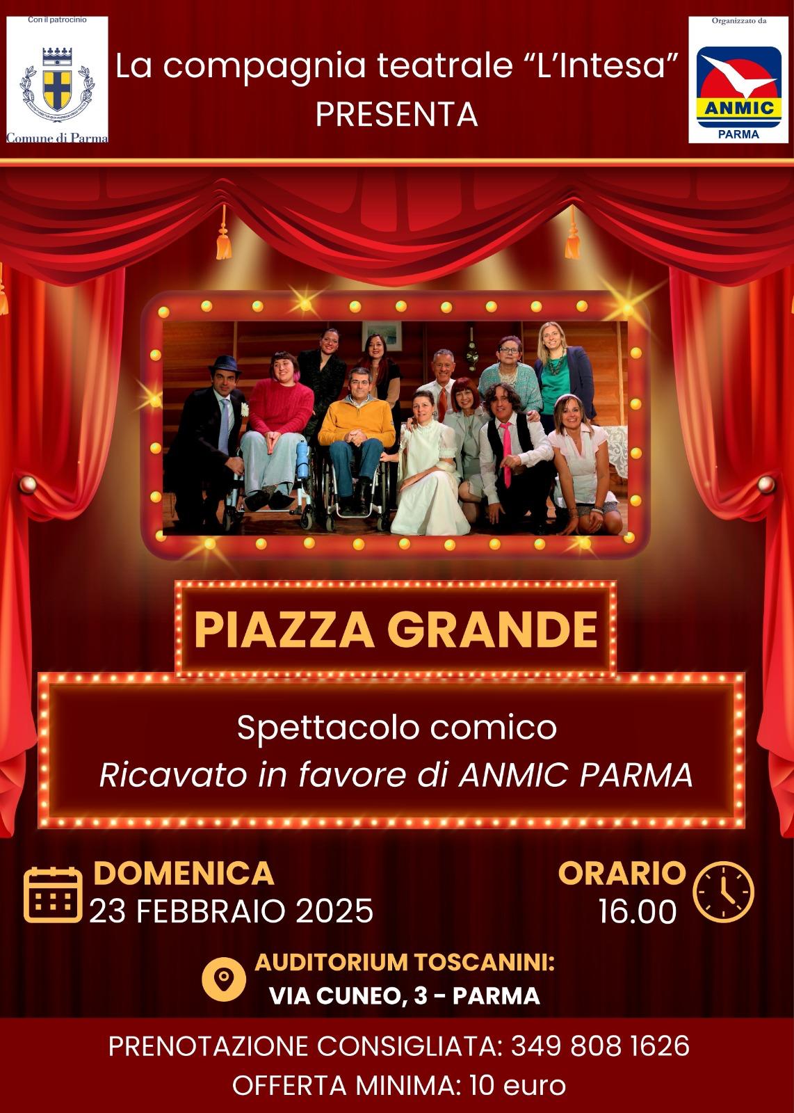 ANMIC Parma invita domenica 23 febbraio alle ore 16, presso l’Auditorium Toscanini in via Cuneo 3 a Parma, allo spettacolo comico “Piazza Grande” della compagnia teatrale “L’Intesa”.