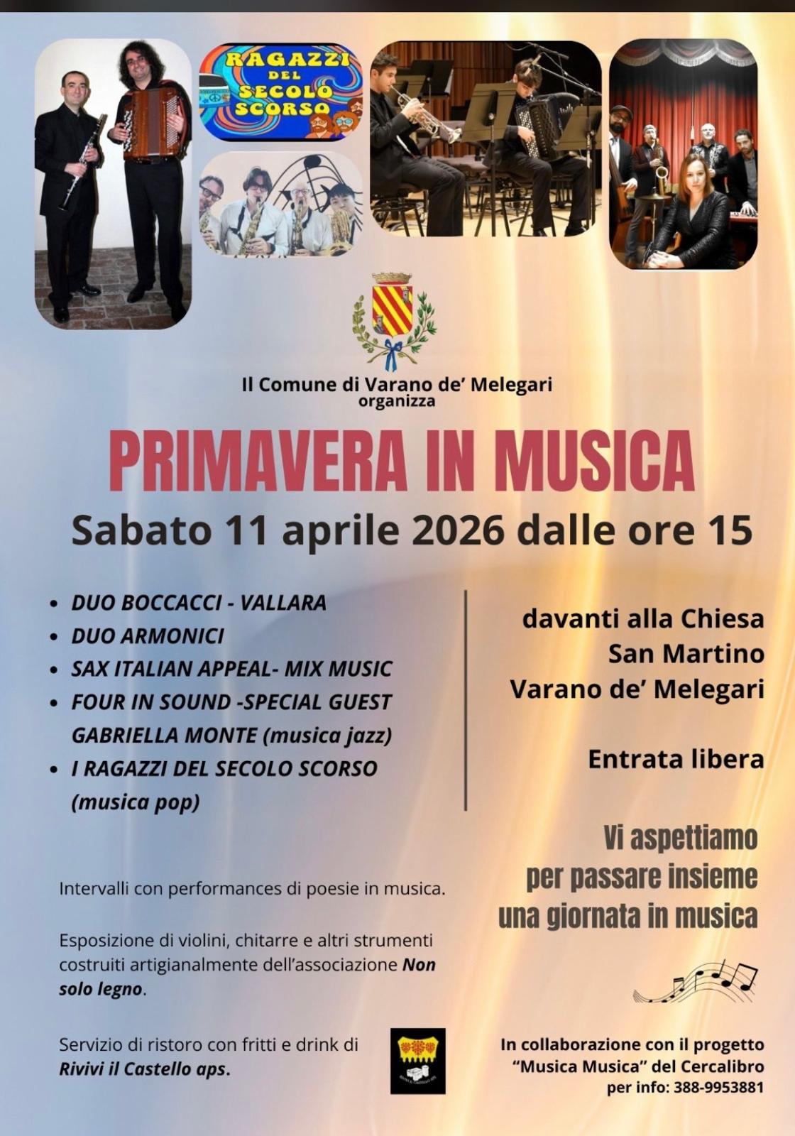 Una giornata all’insegna della musica, della condivisione e della partecipazione: sabato 11 aprile, dalle 15, torna “Primavera in musica”, l’evento promosso dal Comune di Varano de’ Melegari davanti alla Chiesa di San Martino.