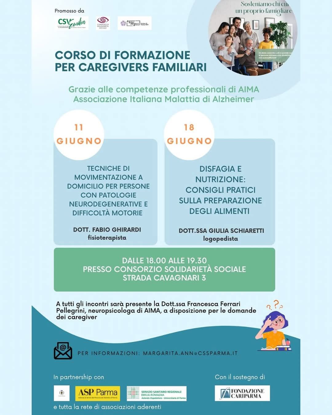 Gli incontri si terranno dalle 18.00 alle 19.30 presso il Consorzio Solidarietà Sociale (Strada Cavagnari 3, Parma). Sarà presente anche la neuropsicologa di Francesca Ferrari Pellegrini (AIMA Parma), a disposizione per le domande dei partecipanti.