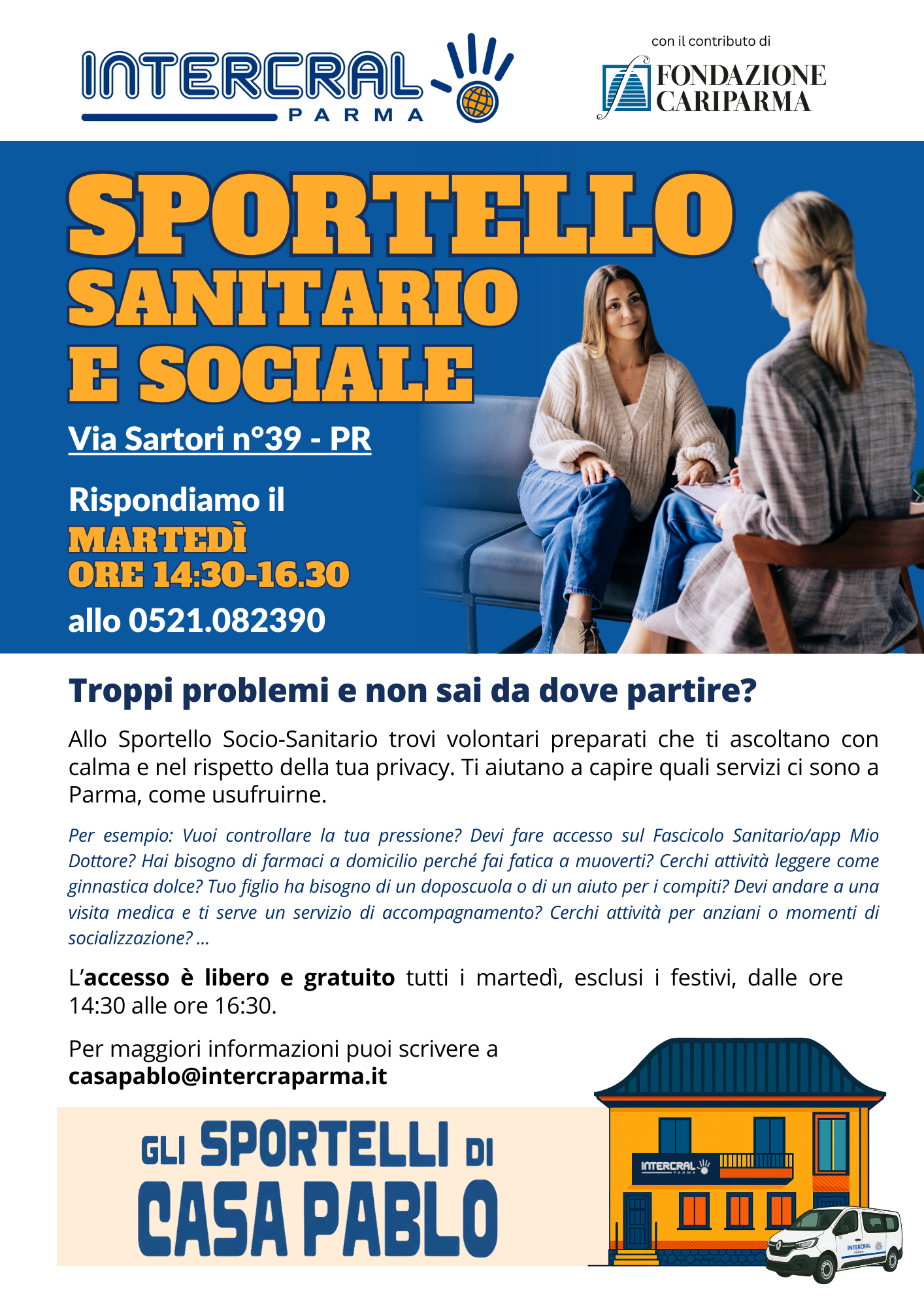 A Casa Pablo è attivo lo Sportello Sanitario e Sociale di Intercral Parma, uno spazio di ascolto e orientamento, gratuito, pensato per aiutare le persone a districarsi tra servizi, pratiche e bisogni quotidiani.