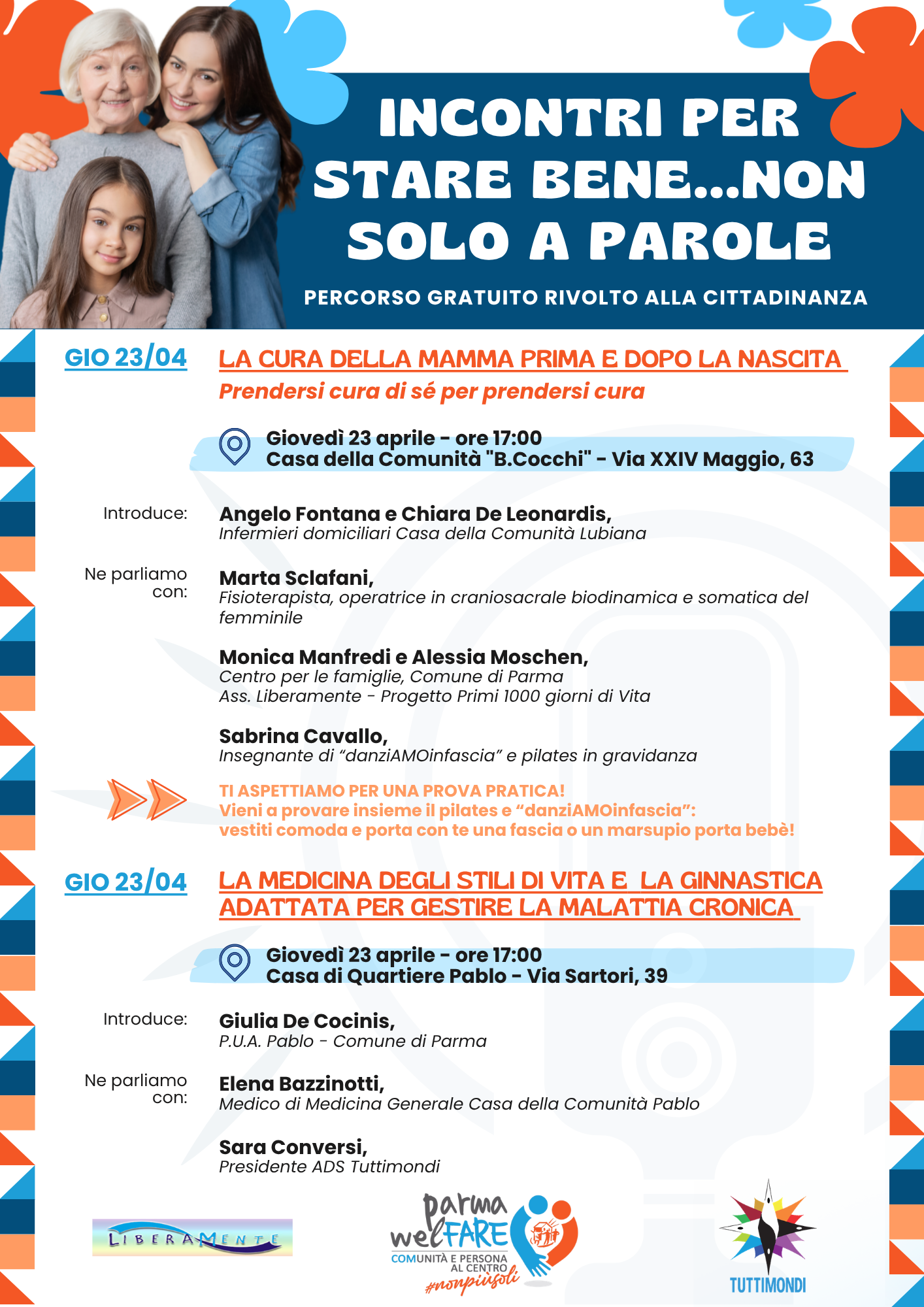 Interverranno: Angelo Fontana e Chiara De Leonardis, Infermieri domiciliari Casa della Comunità Lubiana; Marta Sclafani, Fisioterapista, operatrice in craniosacrale biodinamica e somatica del femminile; Monica Manfredi Centro per le famiglie, Comune di Parma e Alessia Moschen, Associazione Liberamente – Progetto Primi 1000 giorni di Vita; Sabrina Cavallo, Insegnante di “danziAMOinfascia” e pilates in gravidanza (vestiti comoda e porta con te una fascia o un marsupio porta bebè) - “La medicina degli stili di vita e la ginnastica adattata per gestire la malattia cronica” alla Casa di Quartiere Pablo, in via Sartori 39.