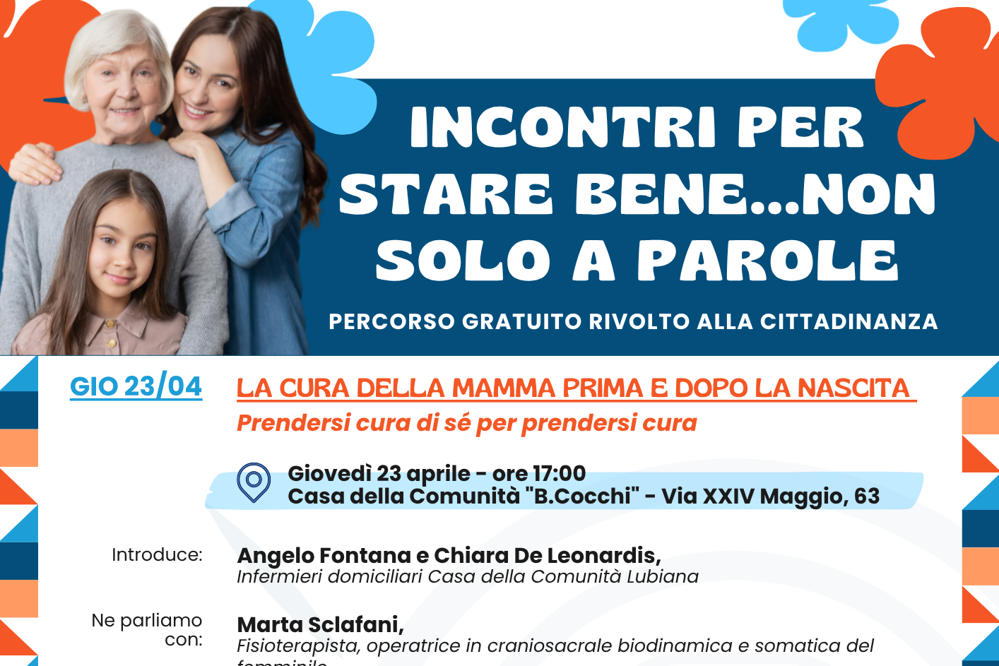 - “La cura della mamma prima e dopo la nascita. Prendersi cura di sé per prendersi cura” alla Casa della Comunità “B. Cocchi”, in via XXIV Maggio 63.