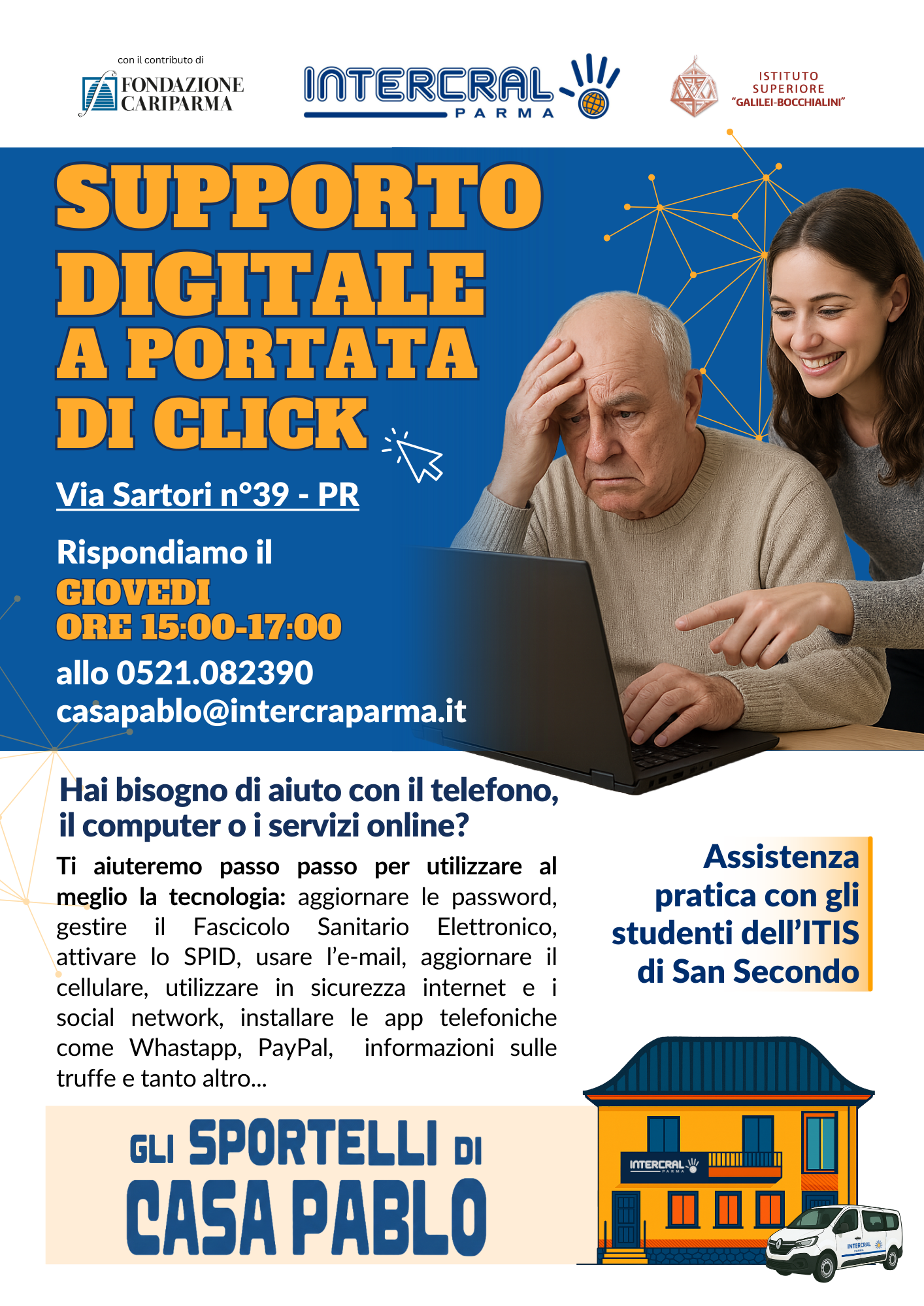 È attivo a Parma lo Sportello di supporto digitale di Casa Pablo, promosso da Intercral Parma con il contributo di Fondazione Cariparma e in collaborazione con l’Istituto Superiore Galilei-Bocchialini.