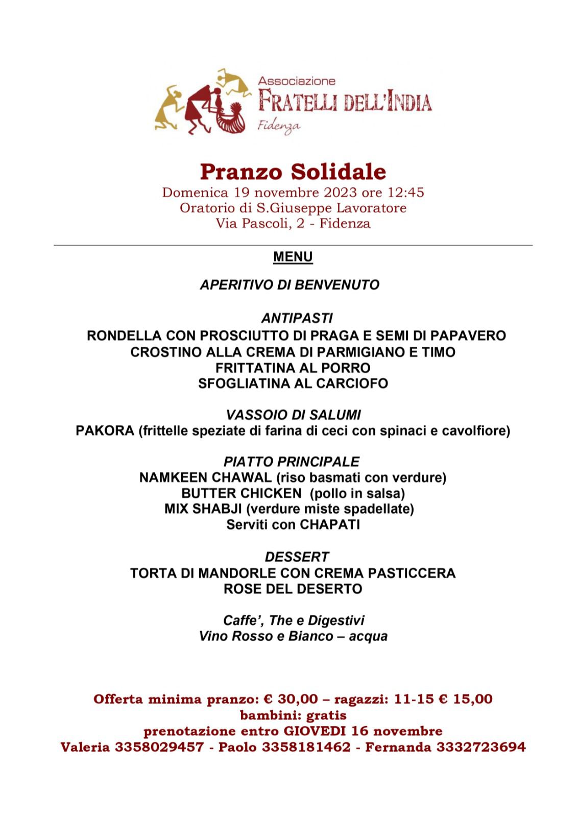 Domenica 19 novembre si terrà a partire dalle 12,45 presso l’oratorio della parrocchia di San Giuseppe, in via Pascoli 12 a Fidenza, il Pranzo solidale” per sostenere i vari progetti che l’associazione Fratelli dell’India ha attivi in India.