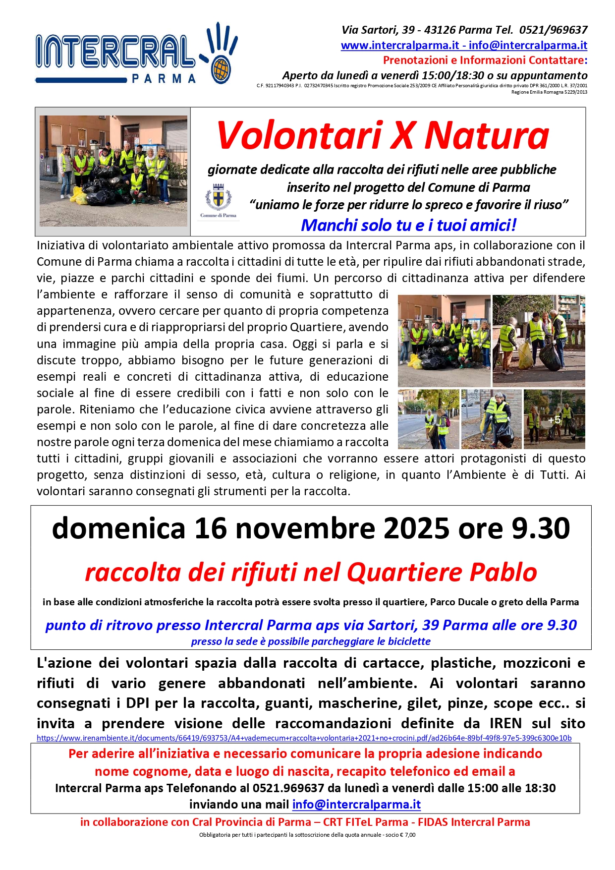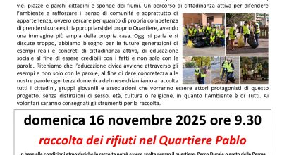 Intercral Parma Aps invita domenica 16 novembre a partecipare ad una giornata dedicata alla raccolta dei rifiuti nelle aree pubbliche del Quartiere Pablo.